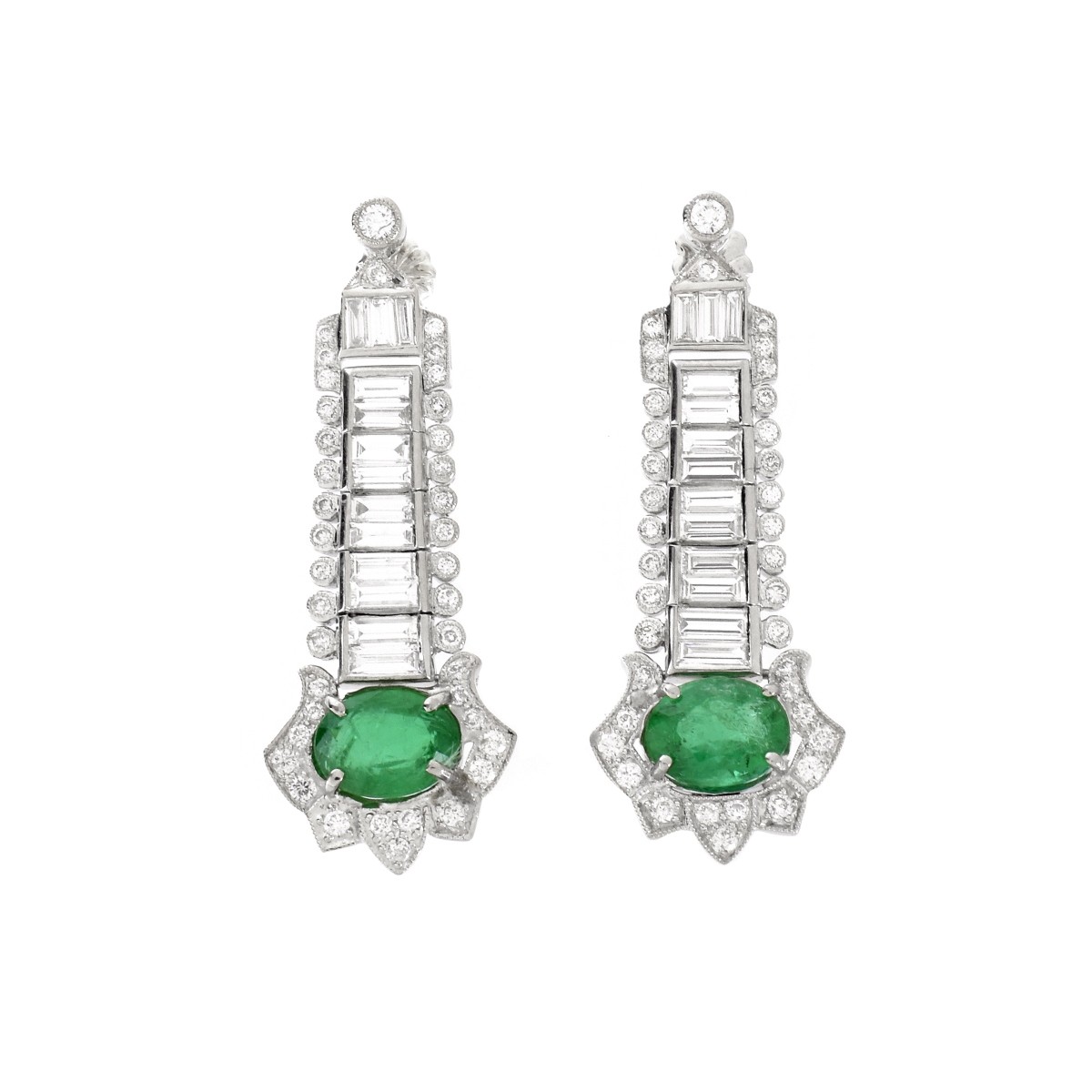 Approx. 3.10 Carat TW Two Oval Cut Emerald, 3.60 Carat TW Baguette and Round Brilliant Cut Diamond and Platinum Pendant Earrings. Emeralds with vivid saturation of color. Diamonds E-F color, VS clarity. Measure 1-1/2" L, 9/16" W. Approx. weight: 11.90 grams. Condition: Very good condition. Estimate: $6000.00 - $9000.00 Domestic Shipping: $30.00