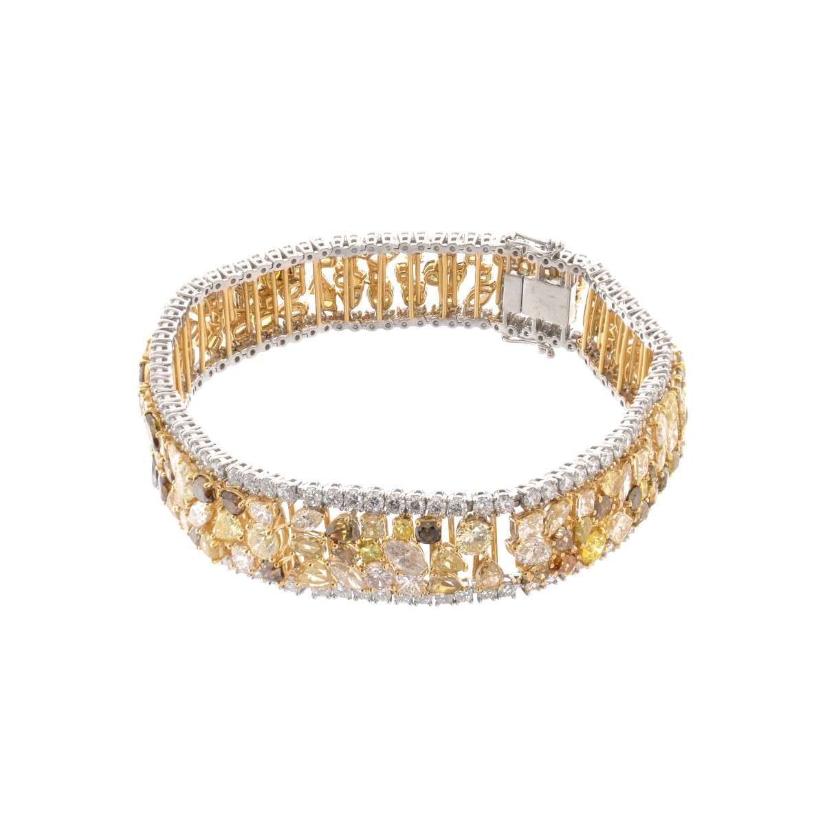 Fine Quality Diamond and 18 Karat Yellow and White Gold Bracelet. Set with 27.58 carat TW one hundred fifty-two multi-cut, natural multi-color diamonds and 6.75 carat TW one hundred sixty-eight round brilliant cut diamonds. Color diamonds VS clarity. White diamonds F-G color, VS clarity. Measures 7-5/8" L, 1/2" W. Approx. weight: 40.12 grams. Condition: Very good condition. Estimate: $15,000.00 - $20,000.00 Domestic Shipping: $30.00