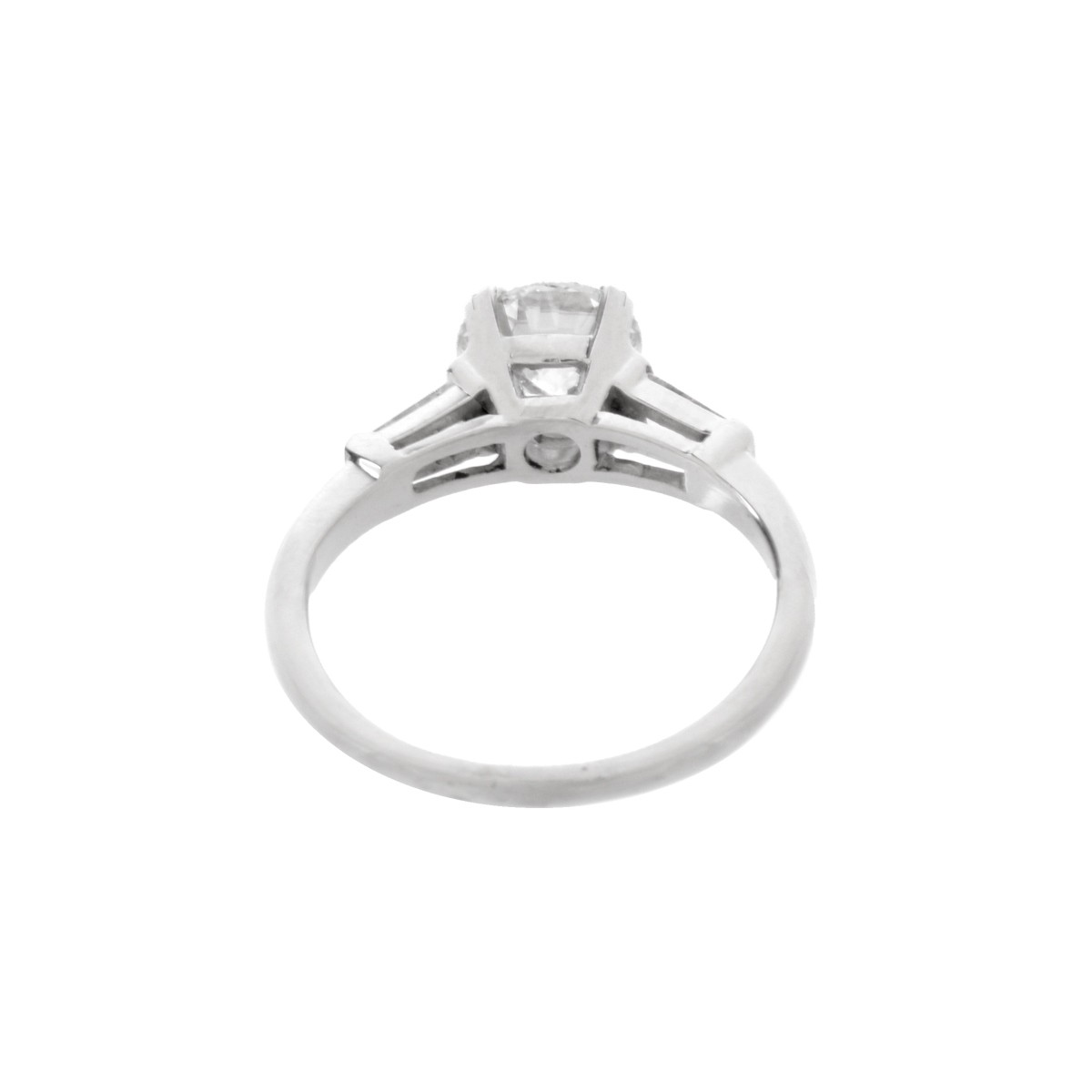 Diamond and Platinum Ring. Set in the center with a 1.0 carat round brilliant cut diamond, G color, SI1 clarity. Accented with .12 carat TW two tapered baguette cut diamonds, E-F color, VS1-VS2 clarity. Stamped Plat. Ring size 6-1/2. Approx. weight: 3.94 grams. Condition: Very good condition. Estimate: $1000.00 - $5000.00 Domestic Shipping: $28.00