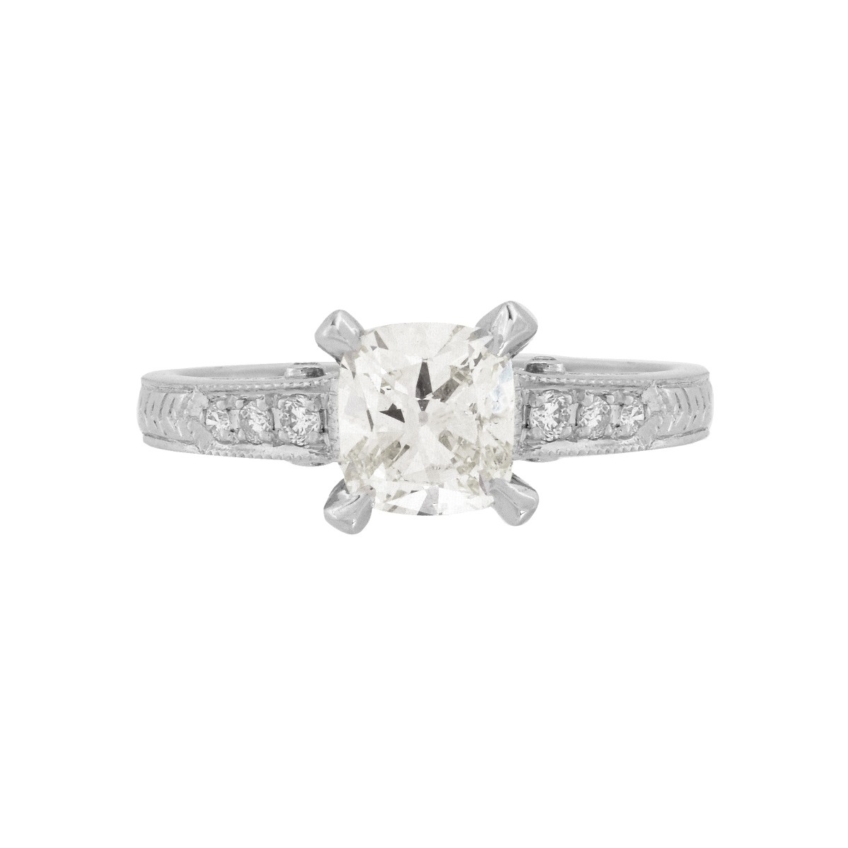 Diamond and Platinum Ring. Set in the center with a 1.06 carat cushion cut diamond, J-K color, VS1 clarity. Accented with .20 carat TW round brilliant cut diamonds E-F color, VS1-VS2 clarity. Stamped Pt900. Ring size 6. Approx. weight: 4.98 grams. Condition: Very good condition. Estimate: $1000.00 - $5000.00 Domestic Shipping: $28.00