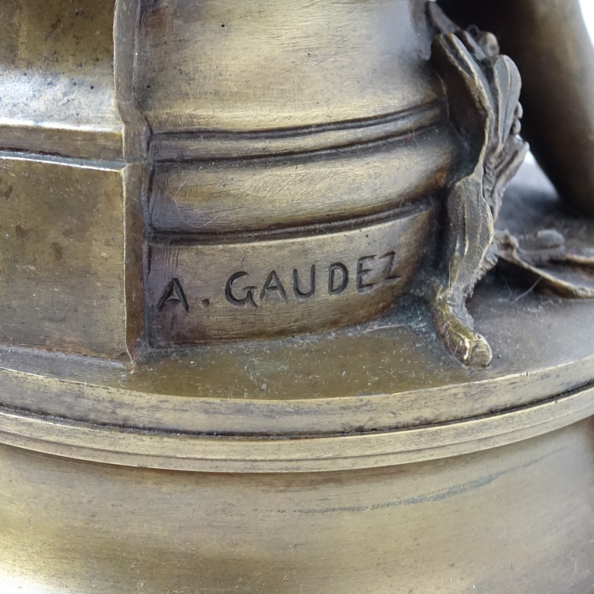 Adrien Etienne Gaudez, French (1845 - 1902) Bronze Sculpture "Gloire Au travail" (hors concours) Signed on Obverse Side. Inscribed tag affixed to base. Measures 28" x 13'. Condition: Good condition. Estimate: $1000.00 - $1500.00 Domestic Shipping: Third party