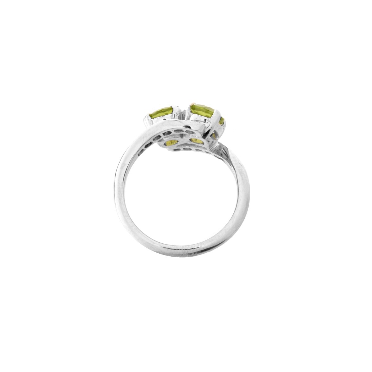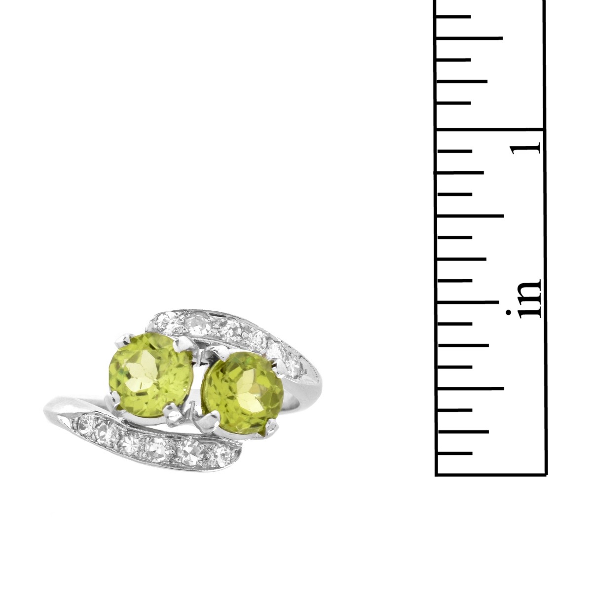 Approx. 2.0 Carat TW Two Round Cut Peridot, Round Brilliant Cut Diamond and Platinum Bypass Ring. Peridot with vivid color. Diamonds F-G color, VS clarity. Stamped Plat. Ring size 7-1/2. Approx. weight: 6.39 grams. Condition: Very good condition. Estimate: $600.00 - $1000.00 Domestic Shipping: $28.00
