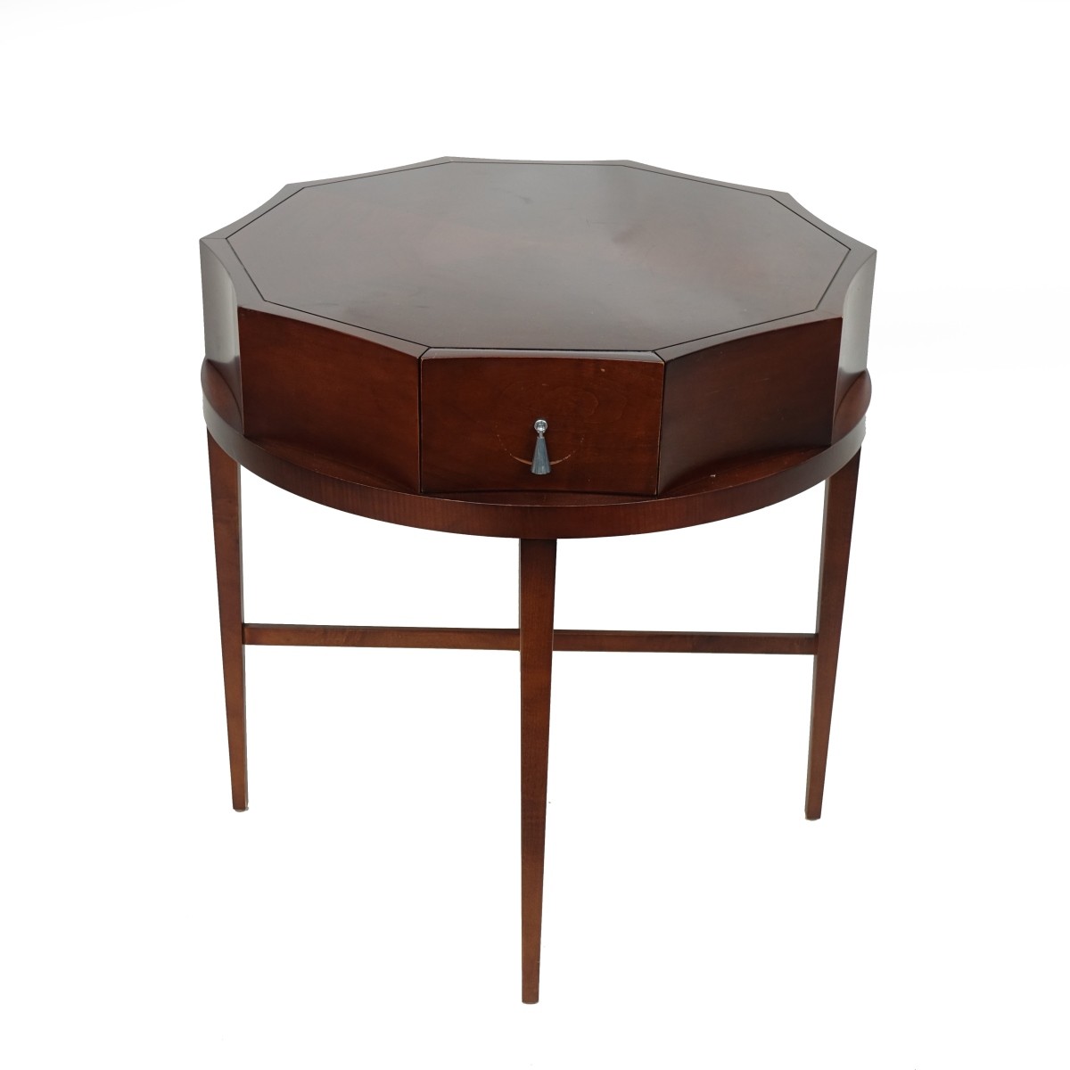 Barbara Barry for Baker Furniture Mahogany Side Table. Baker label to drawer interior. Measures 26" H, 26" diam. Condition: Good pre-owned condition. Light surface rubbing / wear. Estimate: $100.00 - $300.00 Domestic Shipping: Third party