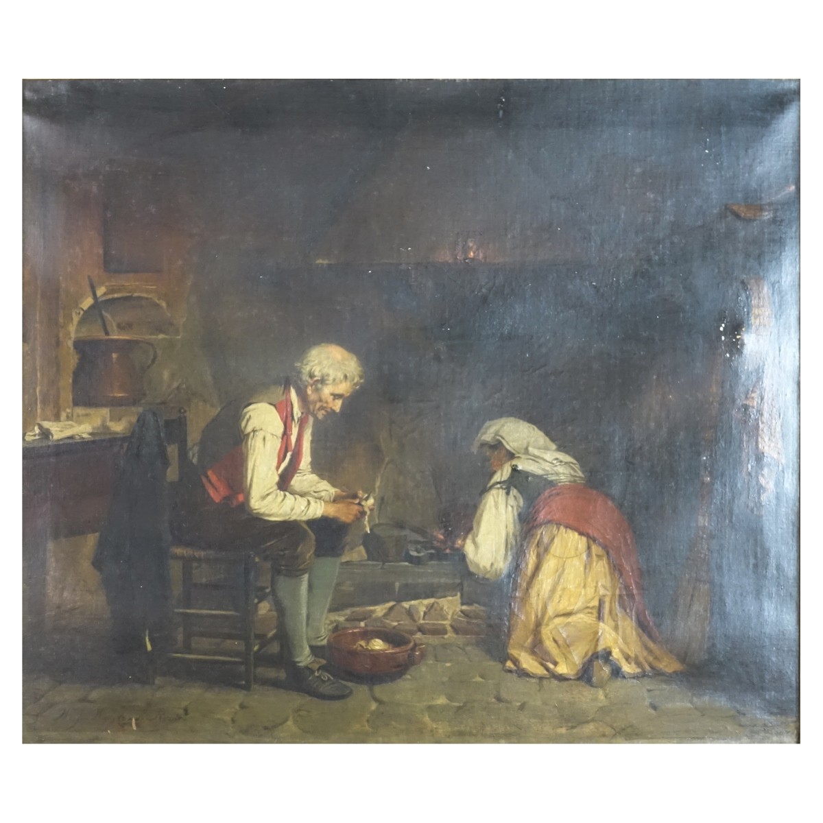19th Century German School Oil on Canvas "Interior Scene with Figures" Signed Lower Left. Measures 25" x 30-1/4", frame measures 40" x 43-3/8". Condition: Craquelure, some small paint loss, spotting otherwise good condition. Estimate: $500.00 - $1500.00 Domestic Shipping: Third party