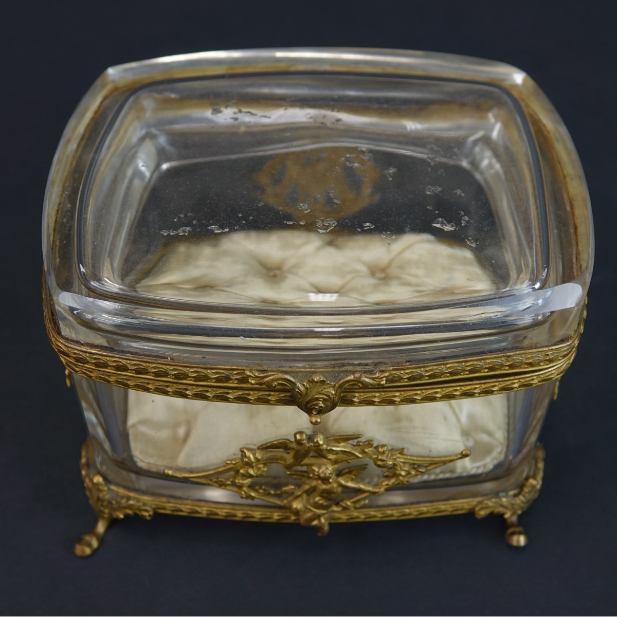 Antique Circa 19/20th Century Gilt Bronze Mounted Crystal Casket / Jewelry Box with Delicate Cupid, Harp and Flower Swag Decoration. Tufted pillow to interior. Unsigned. Measures 3-1/4" H, 4-3/4" W. Condition: Small abrasions to crystal top, feet are slightly bent. Overall good antique condition. Estimate: $300.00 - $500.00 Domestic Shipping: $44.00