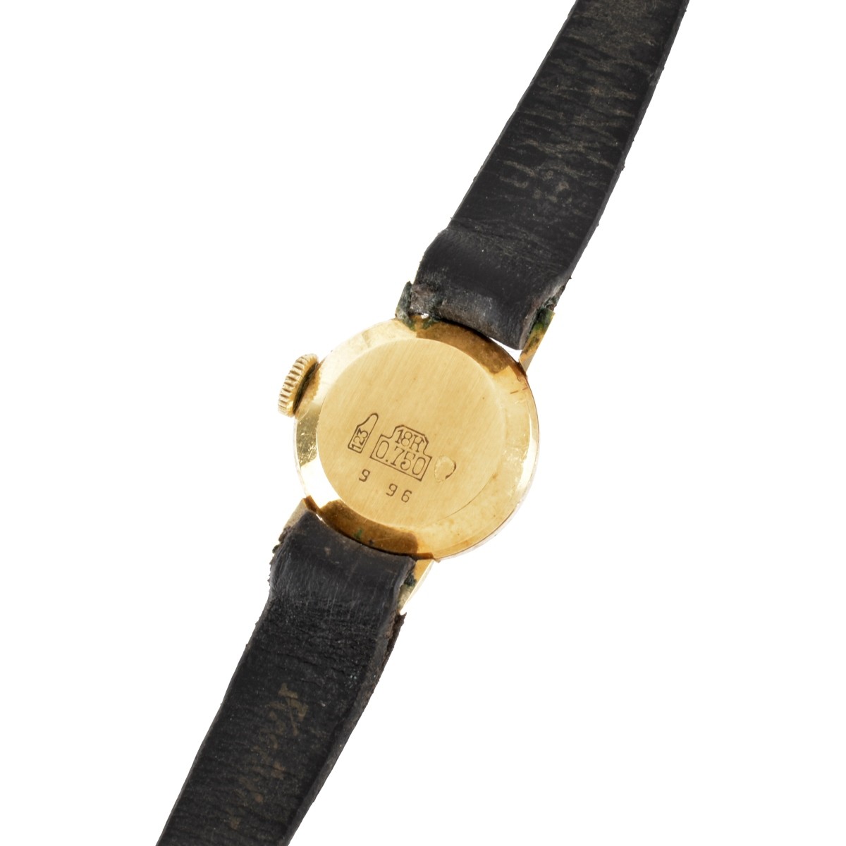 Lady's Vintage Bucherer 18 Karat Yellow Gold Watch with Leather Strap. Signed, stamped 18K, 750. Case measures 17mm. Approx. weight: 8.97 grams. Condition: Good vintage pre-owned condition. Surface wear and scratches. Appears to need servicing. Please note the gallery does not warranty the running condition of watches. Estimate: $150.00 - $300.00 Domestic Shipping: $30.00