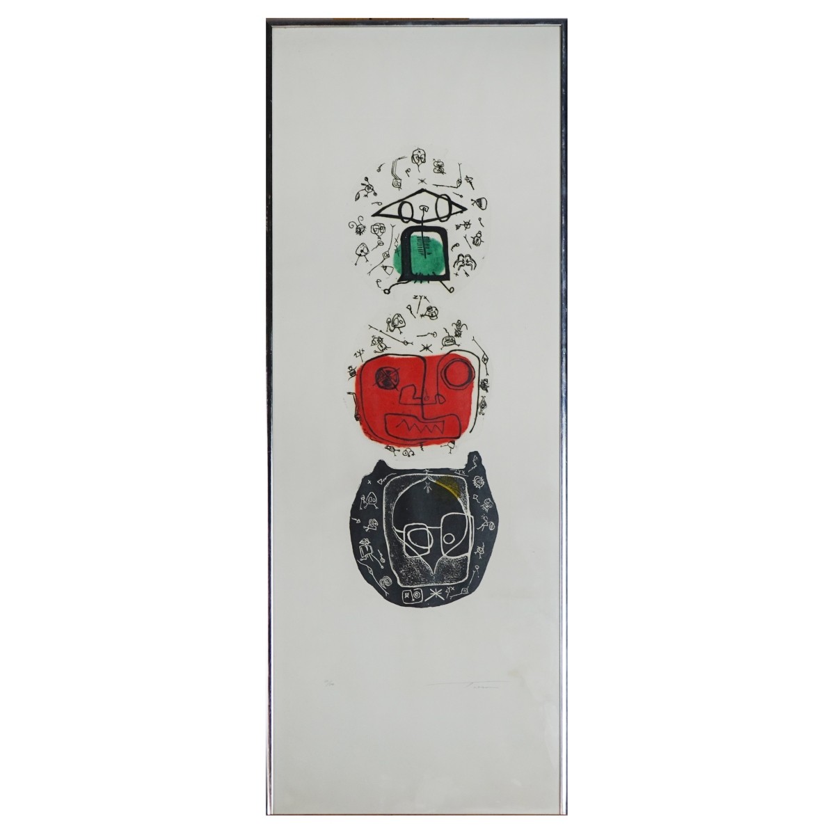 Unknown Artist (20th Century) Color Etching on Paper "Abstract Figural Composition" Pencil Signed and Numbered 11/50. Signature is illegible. Measures 21" x 7", frame measures 30" x 11-1/2'. Condition: Light toning overall good condition. Estimate: $50.00 - $150.00 Domestic Shipping: $125.00