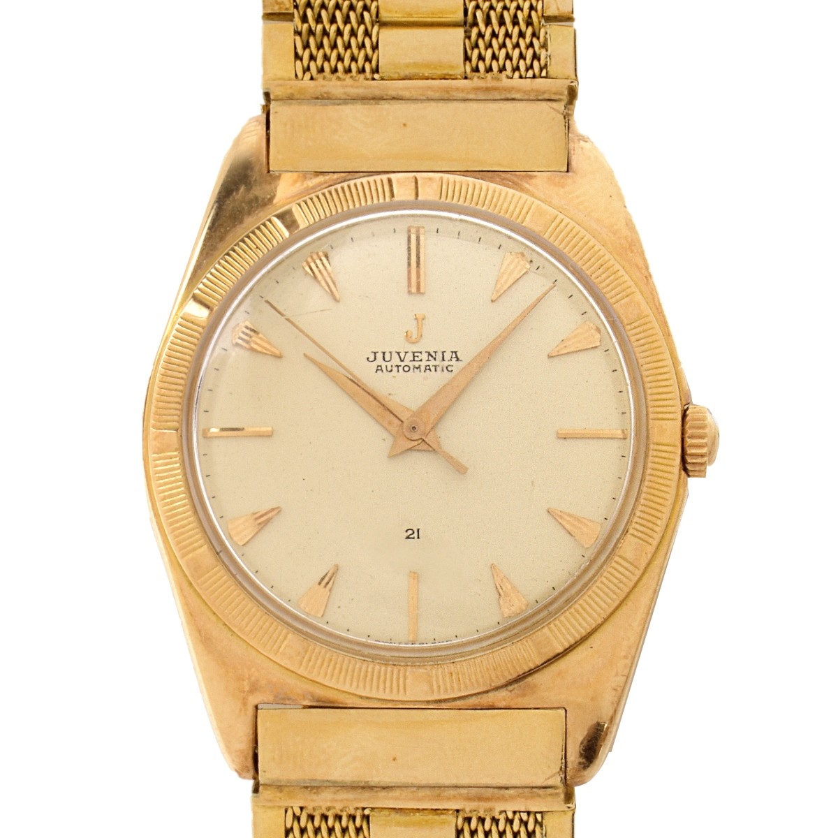 Man's Vintage Juvenia Automatic "21" 18 Karat Yellow Gold Bracelet Watch. Automatic self-winding movement. Case measures 41mm x 32.5mm. Signed, stamped 18K to bracelet clasp. Bracelet measures 7-13/16" L. Approx. weight: 80.77 grams. Condition: Good vintage pre-owned condition. Running. Light surface wear and scratches from normal use. Needs cleaning. Please note the gallery does not warranty the running condition of watches. Estimate: $2000.00 - $3000.00 Domestic Shipping: $32.00
