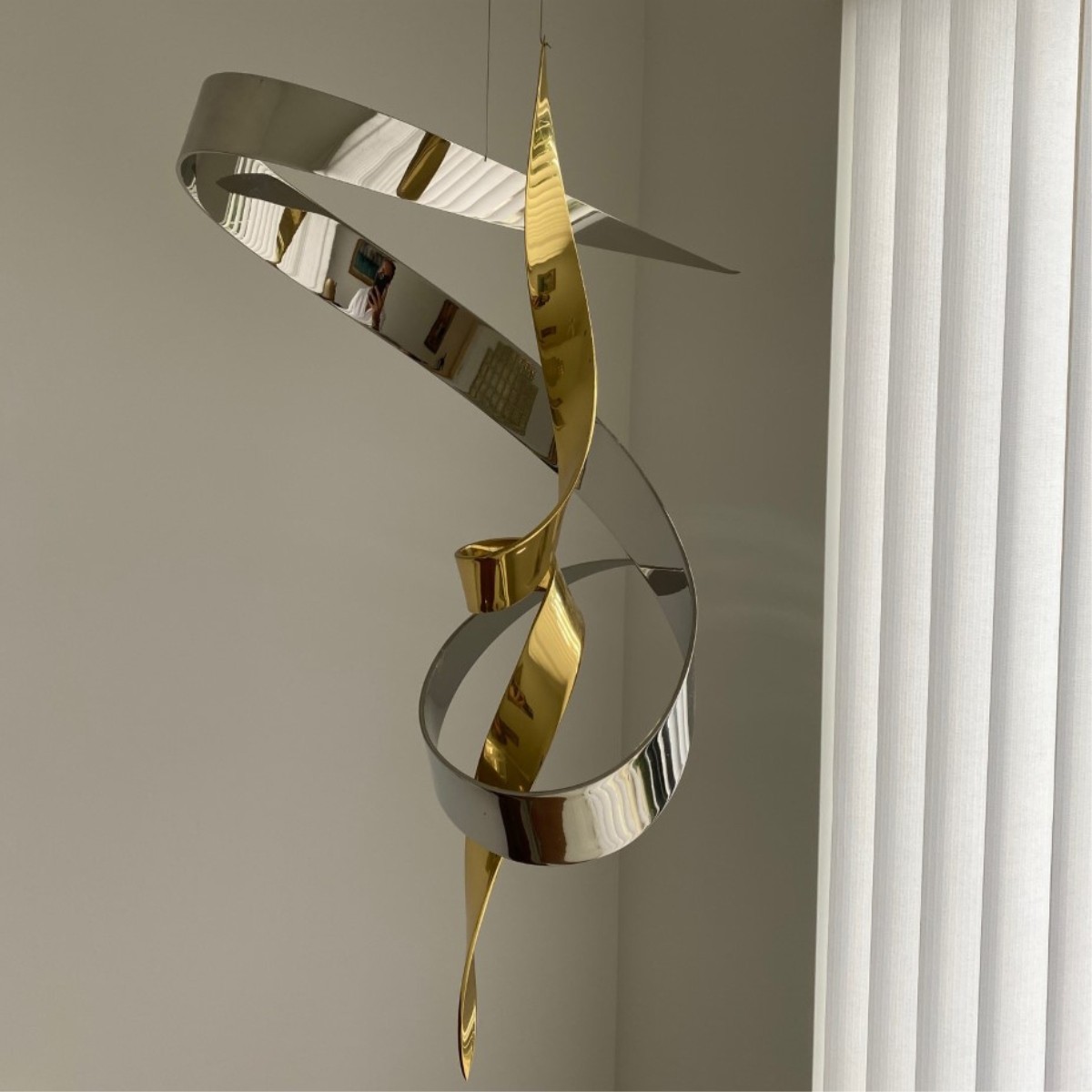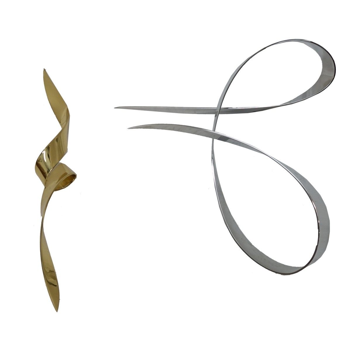 David Herschler (Born 1940) Grouping of Two (2) Abstract Metal Ribbon Form Suspended Sculptures. Each signed. Gold tone section measures 32-3/4", other measures 28-1/4" x 25-1/4". Condition: Good condition. Estimate: $500.00 - $1500.00 Domestic Shipping: Third party