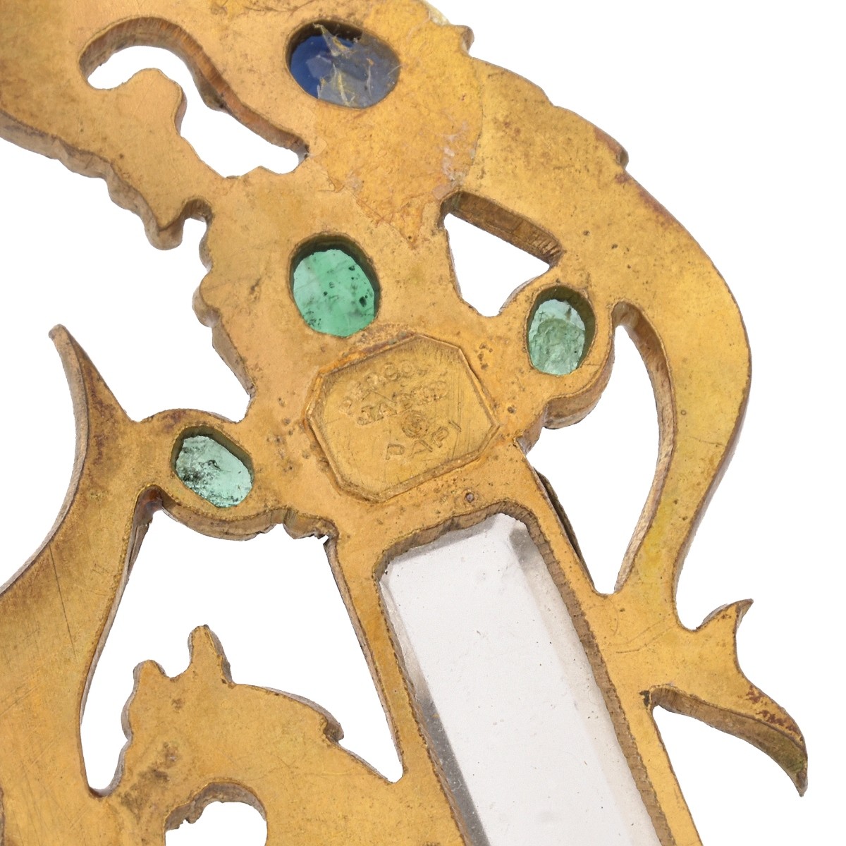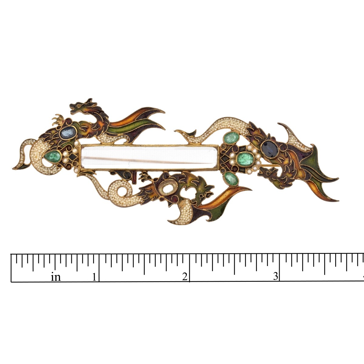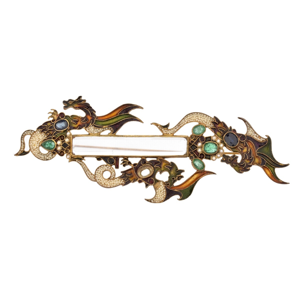 Vintage Italian Percossi Papi Sapphire, Emerald, Seed Pearl, Rock Crystal, Enamel and Gilt Metal Dragon Brooch. Signed, stamped Made in Italy. Measures 3-3/4" H, 1-3/8" W. Approx. weight: 17.33 grams. Condition: Overall very good vintage condition. Missing one small sapphire and a few seed pearls. Estimate: $500.00 - $1000.00 Domestic Shipping: $30.00