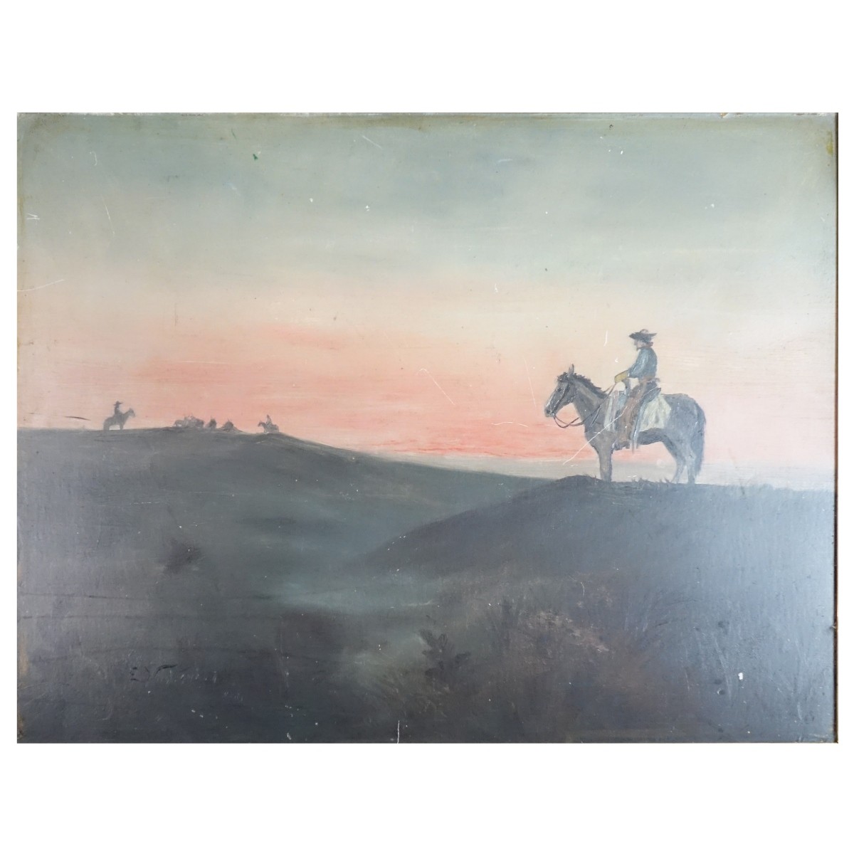 E. Van Hamlin (19/20th Century) American School Oil on Board "Cowboys" Signed and Dated 1906 Lower Left. F.W. Devoe and Co label attached en verso. Measures 18-1/4" x 24-1/4", frame measures 20-3/4" x 26-3/4". Condition: Some light scuffs, spotting otherwise good condition. Estimate: $100.00 - $500.00 Domestic Shipping: $145.00
