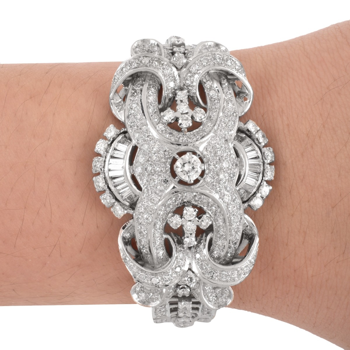 Vintage Circa 1950s Approx. 9.0-9.50 Carat TW Round Brilliant and Baguette Cut Diamond and Platinum Wide Bracelet. Diamonds F-G color, VS1-VS2 clarity. Stamped Plat. Measures 6-1/4" L, 1-3/8" W. Approx. weight: 55.62 grams. For additional information please contact our resident GIA Graduate Gemologist, Russ Kodner at 954.650.5030. Condition: Very good condition. Estimate: $8000.00 - $15,000.00 Domestic Shipping: $32.00
