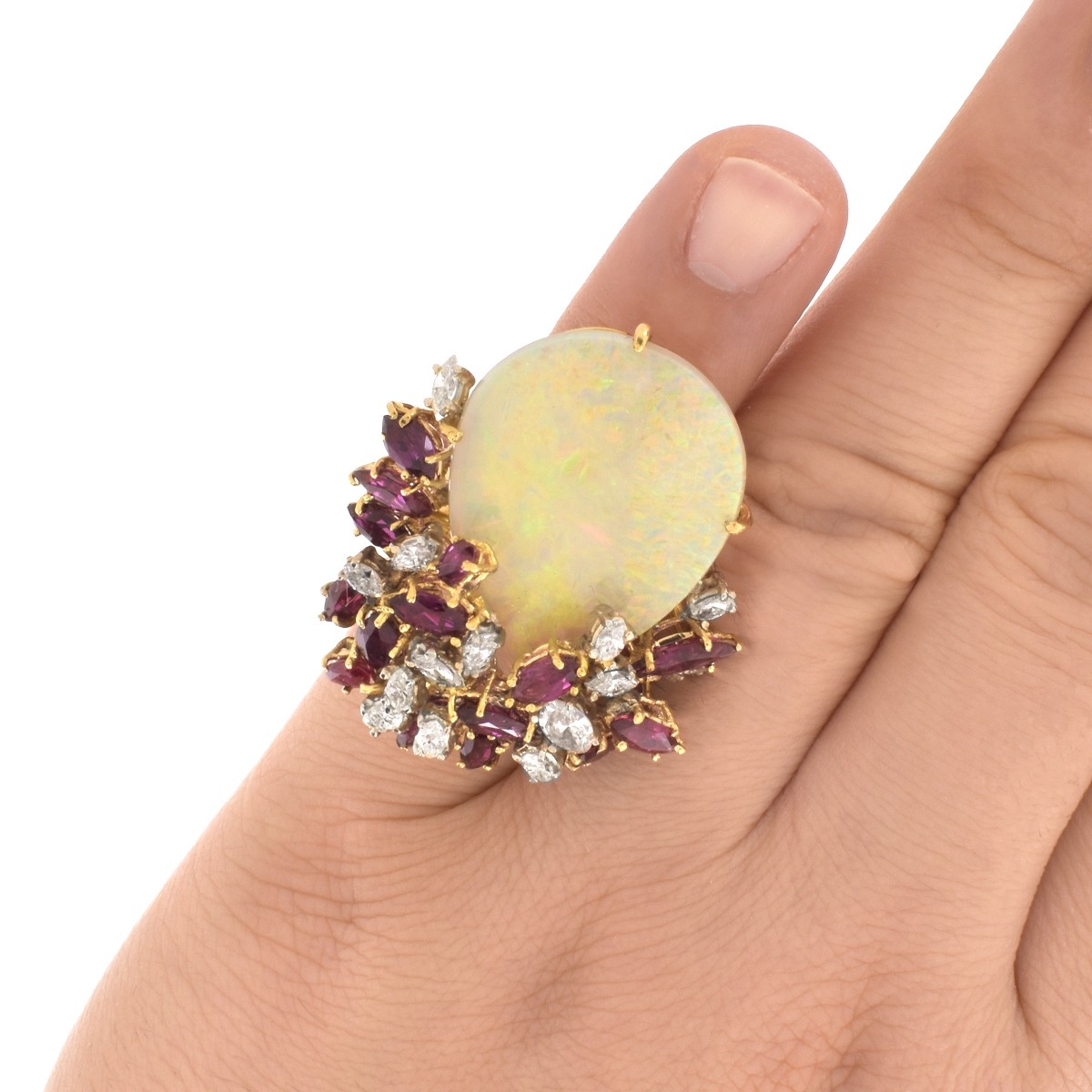 Vintage Large White Opal, Approx. 2.50 Carat TW Marquise Cut Ruby, 1.50 Carat TW Oval Cut Diamond and 18 Karat Yellow Gold Cluster Ring. Opal with good play of multi color. Diamonds D-E color, VS1-VS2 clarity. Gem quality rubies with vivid color. Stamped 18K. Opal measures 27mm x 21mm. Ring size 5. Approx. weight: 28.5 grams. Condition: Very good condition. Estimate: $3000.00 - $4000.00 Domestic Shipping: $28.00