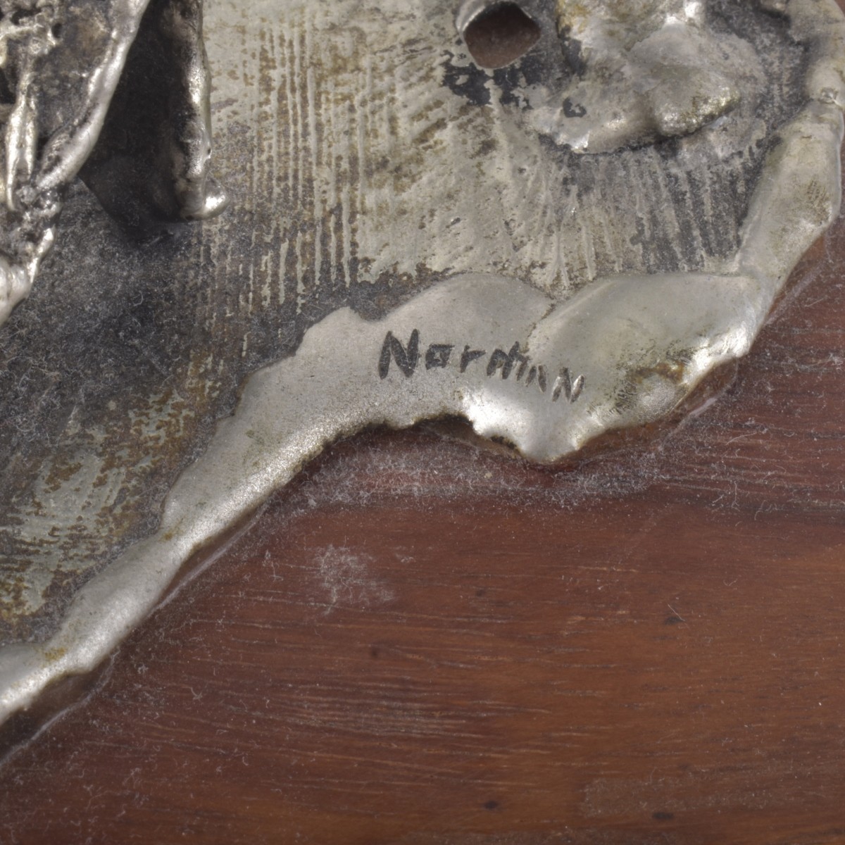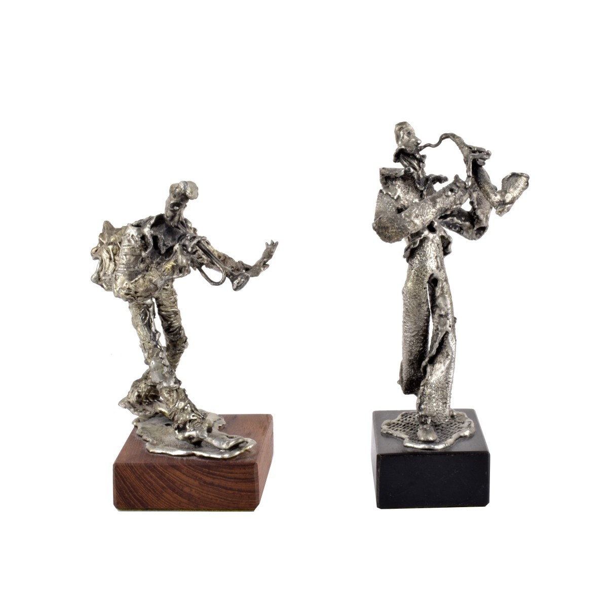 Group Lot of Two (2) Norman Rabinowitz Metal Sculptures Mounted on Wooden Plinth Bases. Signed "Norman". Tallest measures 8-1/2" , other measures 7-3/4". Condition: Good condition. Estimate: $50.00 - $150.00 Domestic Shipping: $66.00