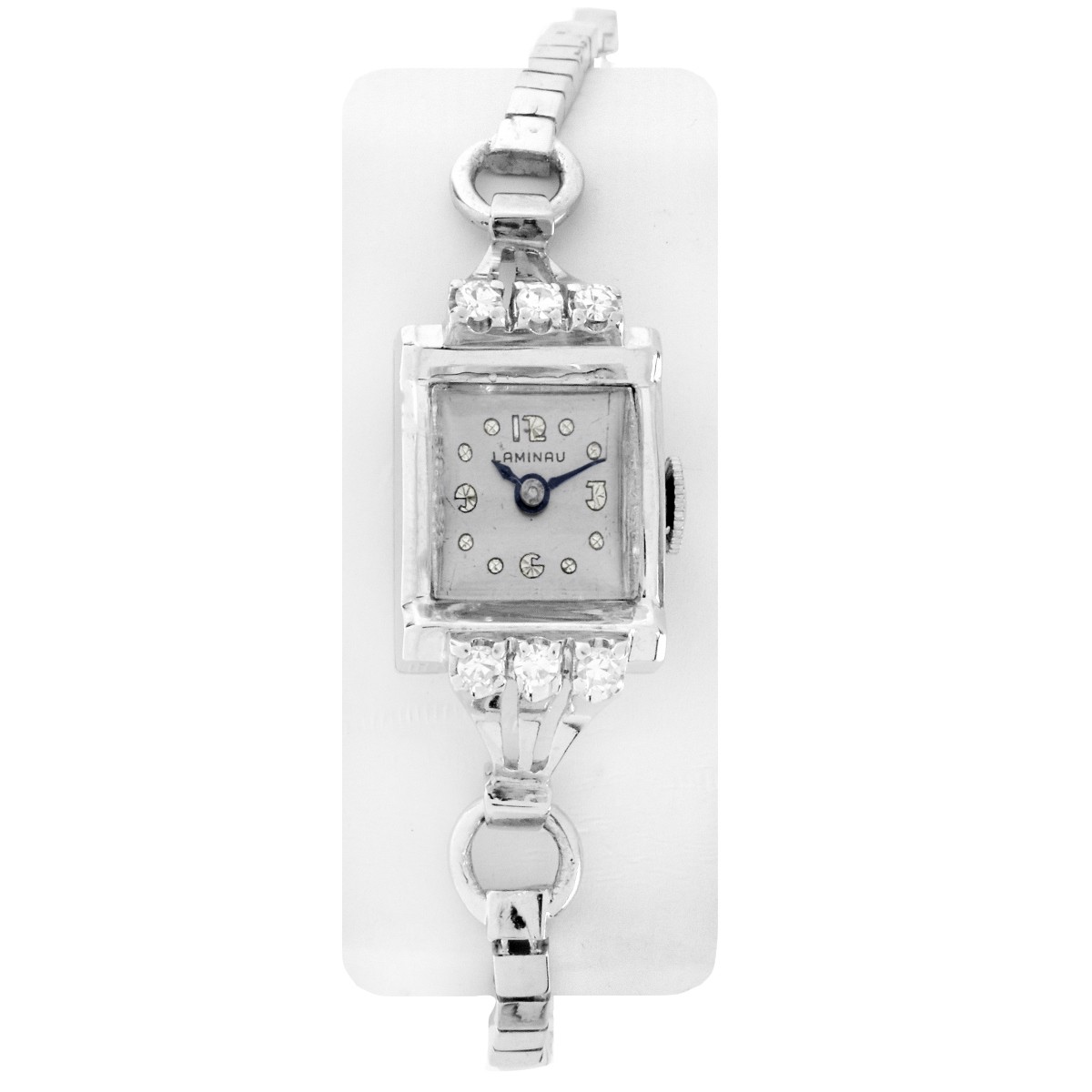 Lady's Vintage Laminau Six Round Brilliant Cut Diamond and 14 Karat White Gold Bracelet Watch with Manual Wind Movement. Case back and clasp stamped 14K. Case measures 18.5mm x 14.0mm; bracelet measures 6" L. Approx. weight: 16.8 grams. Condition: Very good vintage condition. Appears to be running. Please note the gallery does not warranty the running condition of watches. Estimate: $200.00 - $500.00 Domestic Shipping: $30.00