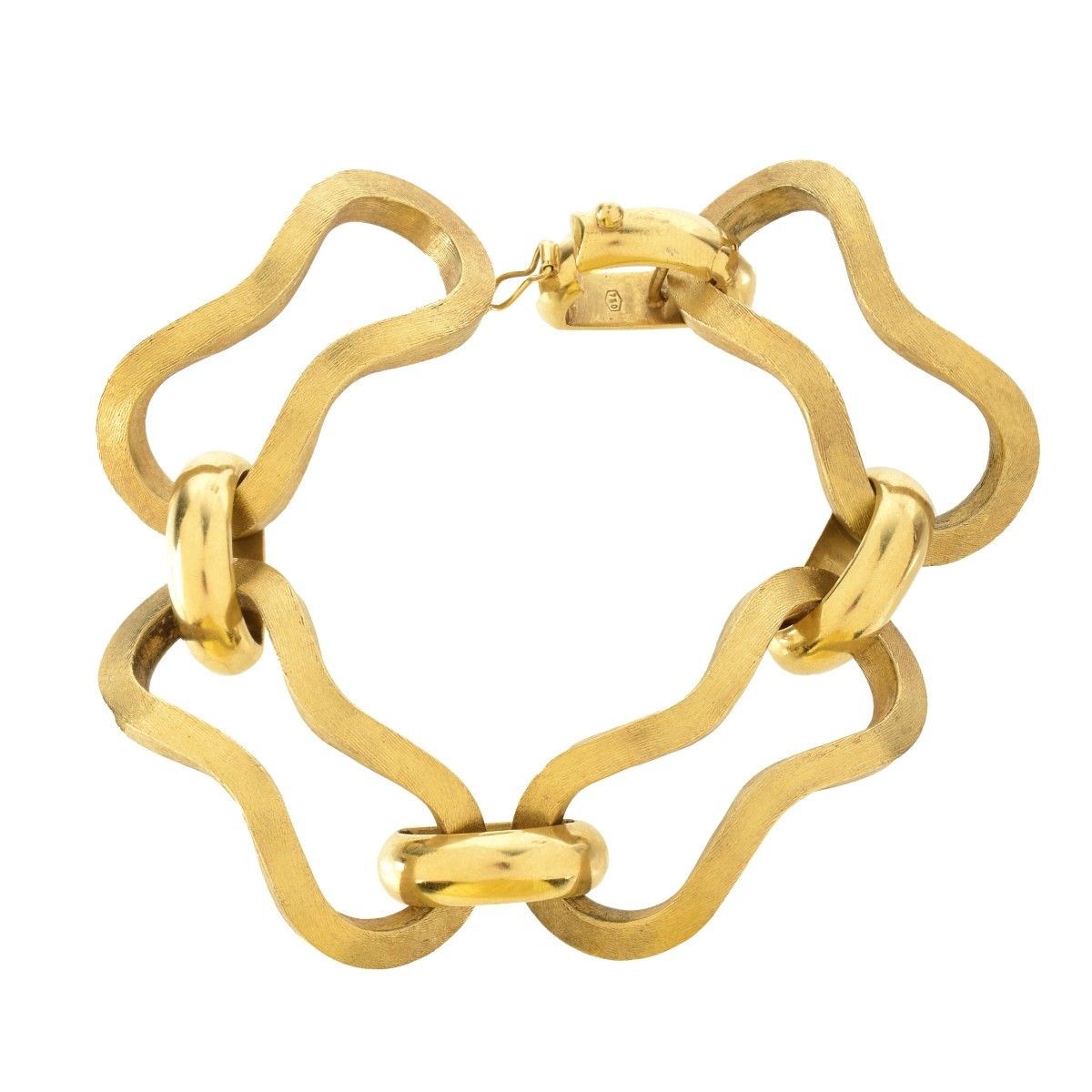 Vintage 18 Karat Yellow Gold Gucci style Link Bracelet. Stamped 750. Measures 7-1/2" L, 3/4" W. Approx. weight: 42.24 grams. Condition: Very good vintage condition. Light surface wear from normal use. Estimate: $500.00 - $2500.00 Domestic Shipping: $30.00