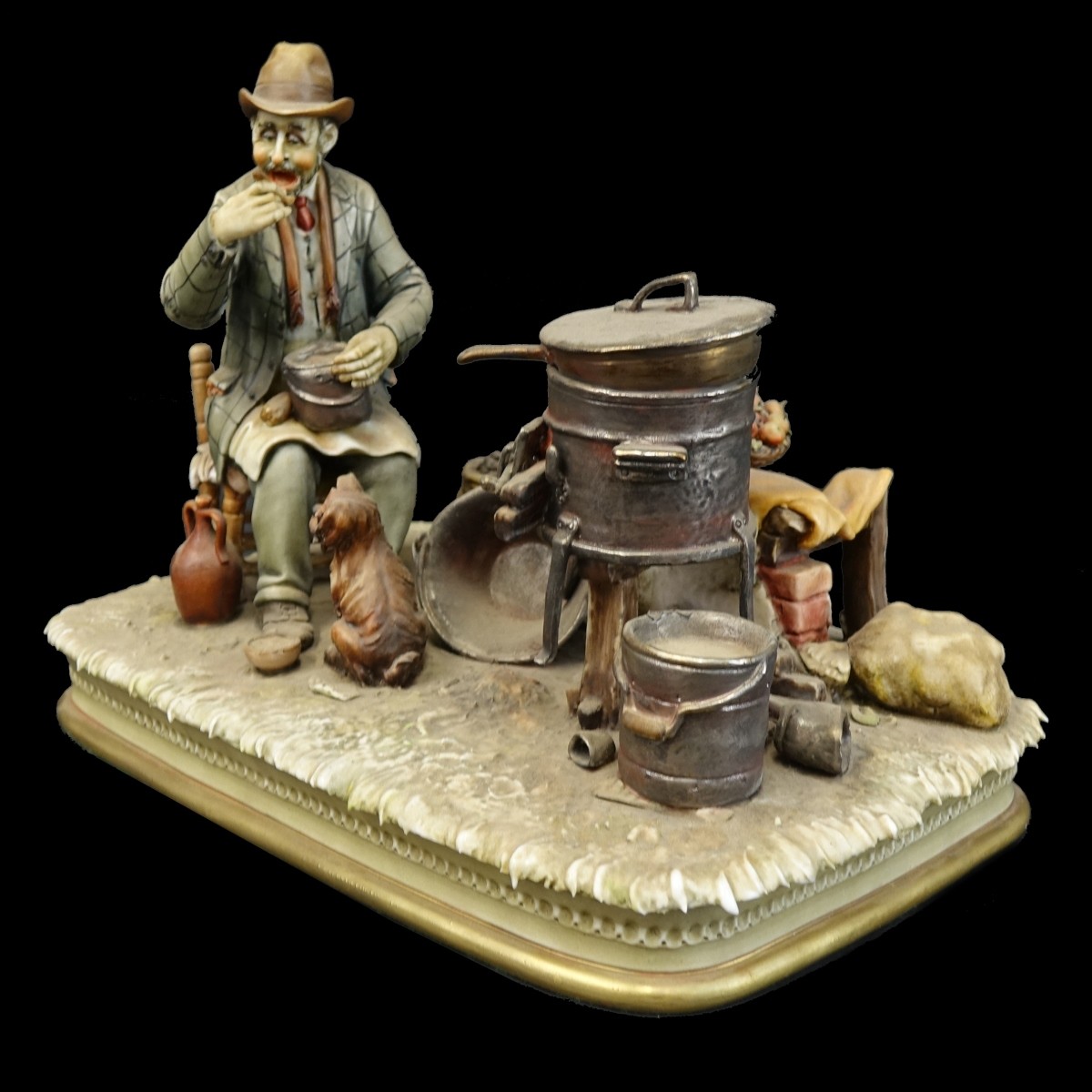 Antique Antonio Borsato "Elderly Man Eating with Dog" Gres D'arte Italian Porcelain Group. Signed on bottom side and signed A. Borsato made in Italy on obverse side. Measures 8-1/8" H x 10-1/4" W x 7-1/4" D. Condition: Needs cleaning otherwise good condition Estimate: $100.00 - $500.00 Domestic Shipping: Third party