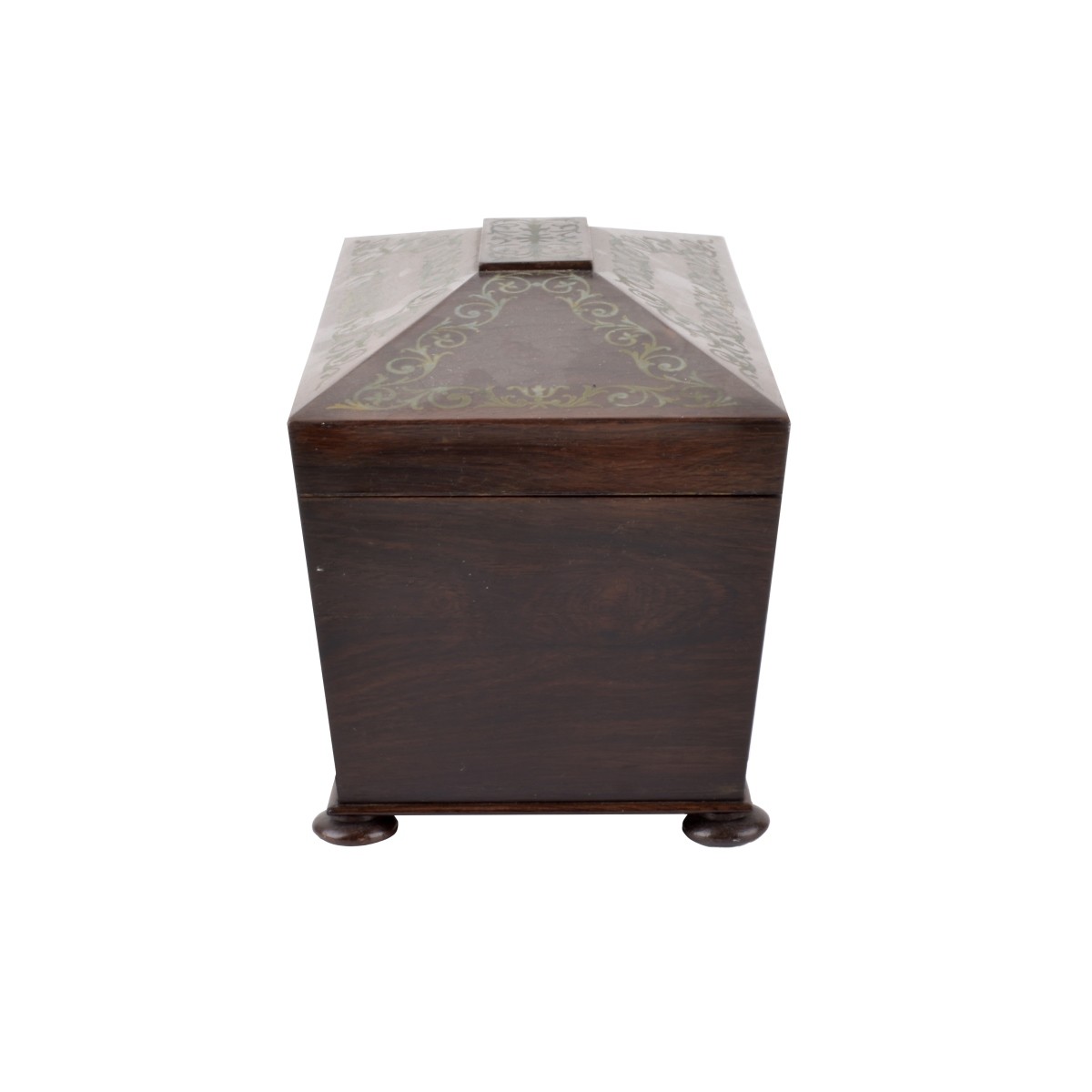 Antique English Regency Rosewood and Brass Inlaid Tea Caddy. Interior bears two caddy areas and mixing bowl area, and stands on rounded feet. Key included. Measures 7-1/2" x 12-1/4" x 6-3/8". Condition: Mixing inserts otherwise good condition. Estimate: $50.00 - $100.00 Domestic Shipping: $68.00