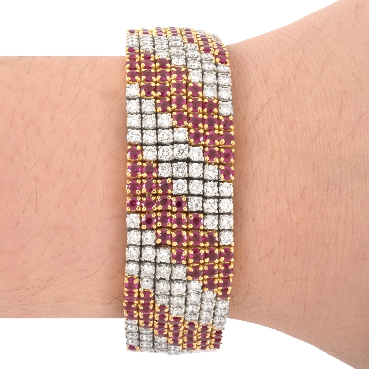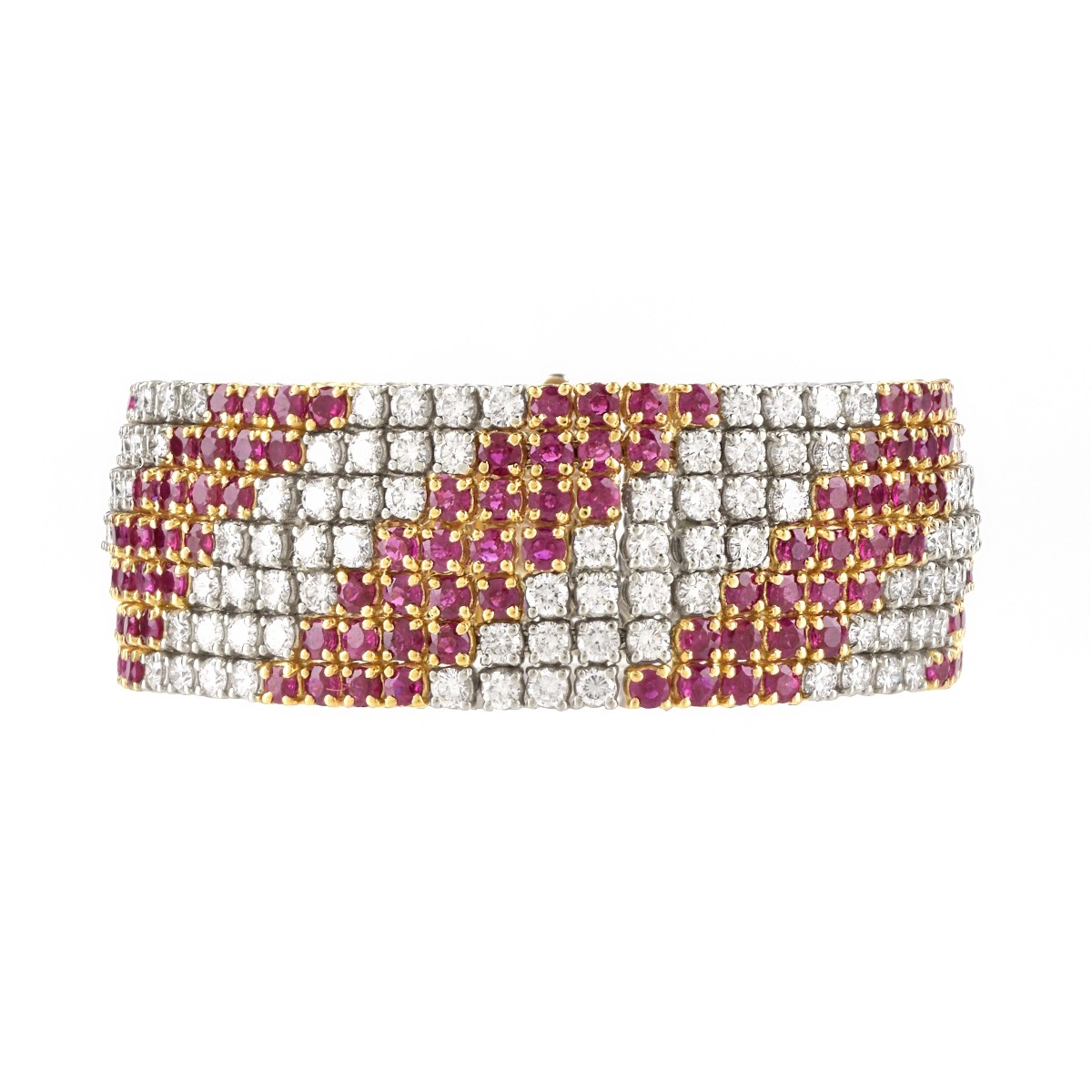 Vintage Approx. 16.0 Carat TW One Hundred Ninety Six Round Brilliant Cut Diamond, 14.0 Carat TW One Hundred Ninety Six Round Brilliant Cut Ruby and 18 Karat Yellow and White Gold Wide Flexible Link Bracelet. Diamonds D-F color, VVS-VS clarity. Rubies with vivid saturation of color. Measures 7" L, 1" W. Approx. weight: 83.90 grams. Condition: Very good vintage condition. Estimate: $15,000.00 - $20,000.00 Domestic Shipping: $32.00