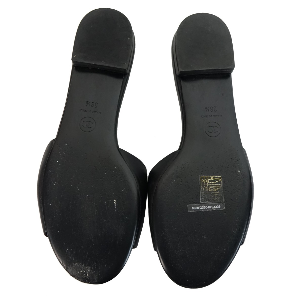 Womens Chanel Black Leather Enamel CC Flat Sandals. Eur. size: 38-1/2. 10% of the proceeds with be donated to the Never Give Up Foundation. In help for children and adults with spinal cord injuries due to accidents or medical problems. Condition: Good used condition. Slight signs of wear. Estimate: $100.00 - $1000.00