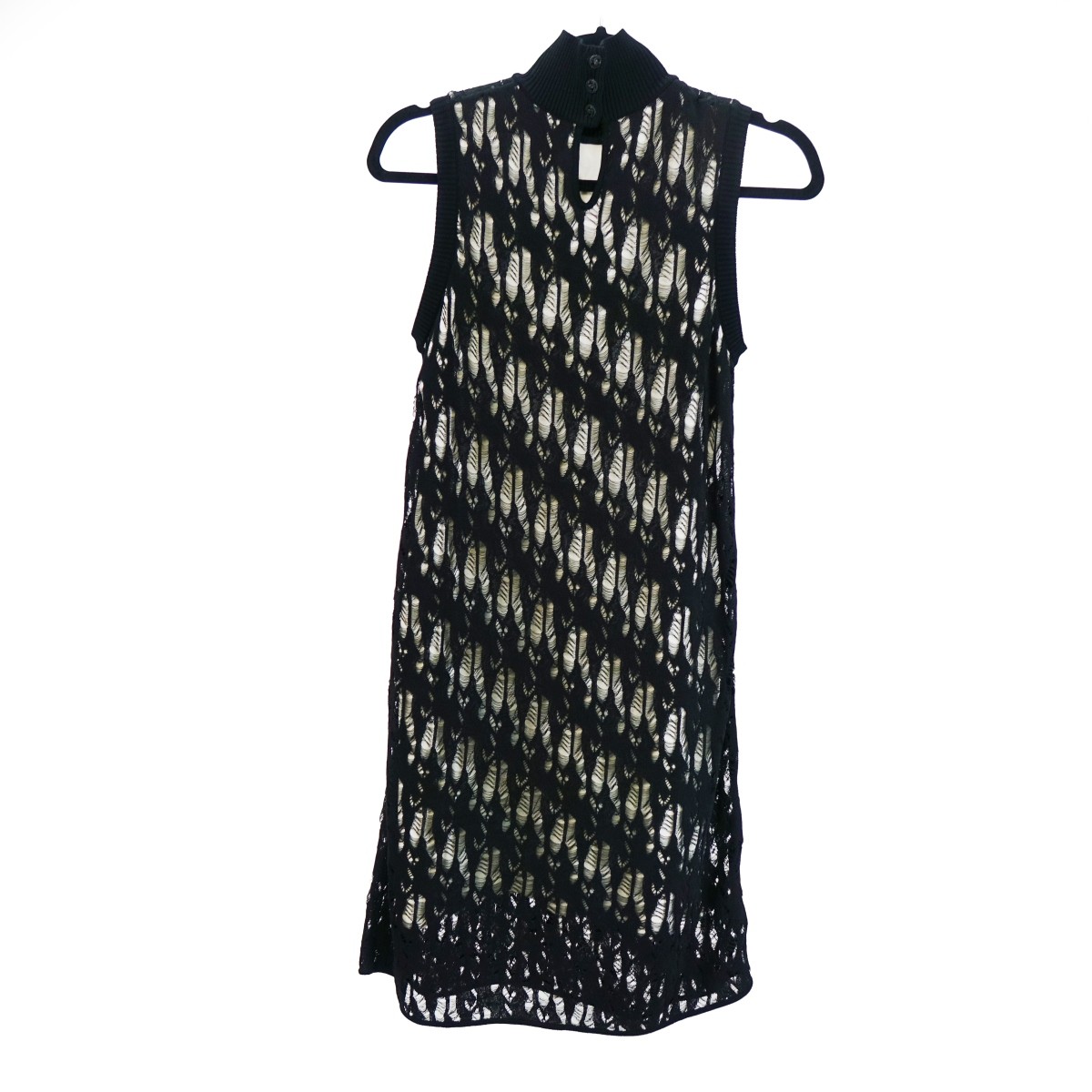 Chanel Black Knit Sleeveless Dress with White Liner. Serial number MP398. Three button collar with CC logo. Eur size: 36. 10% of the proceeds with be donated to the Never Give Up Foundation. In help for children and adults with spinal cord injuries due to accidents or medical problems. Condition: Good used condition. Estimate: $200.00 - $1000.00 Domestic Shipping: $62.00