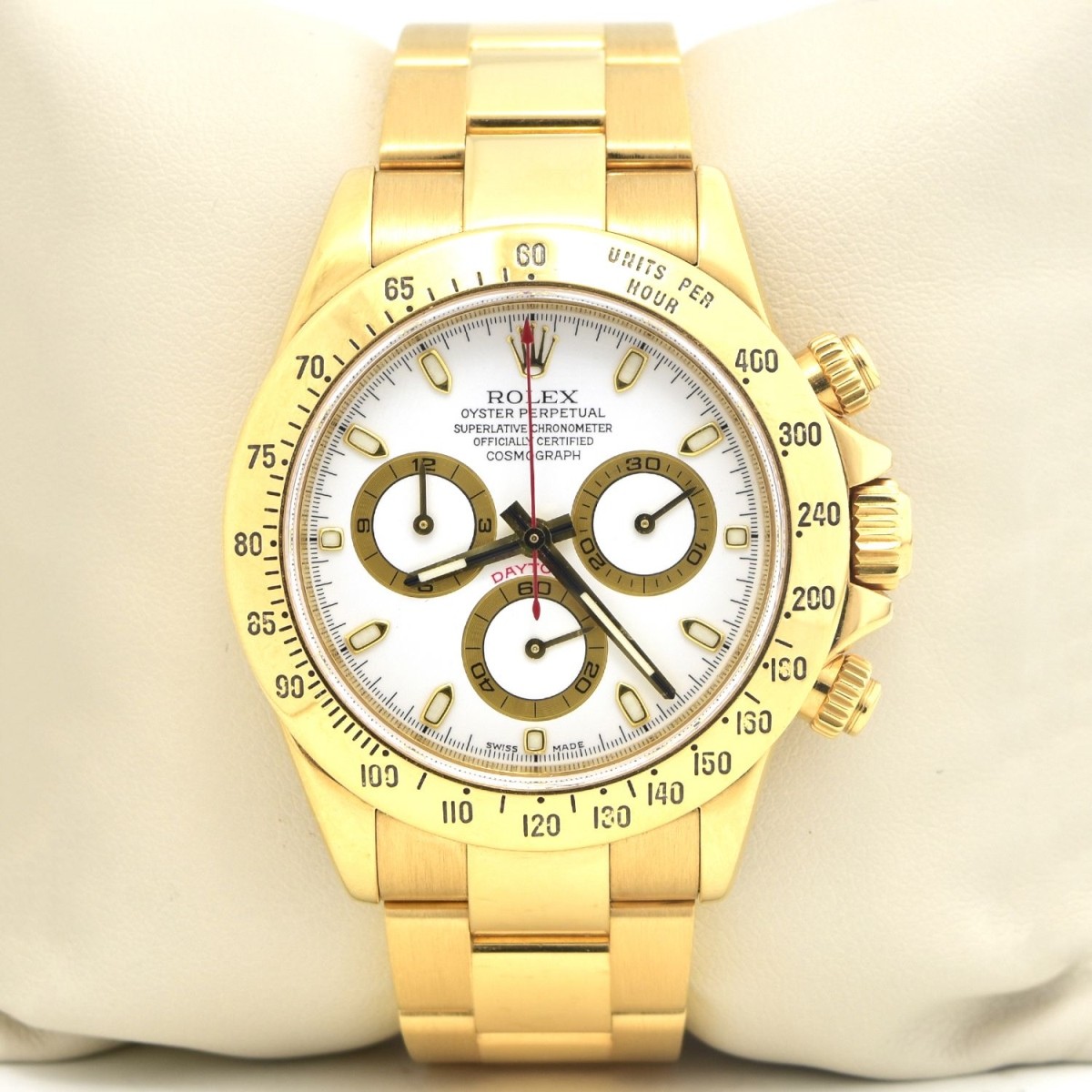 Rolex Dayton 116528 18 Karat Yellow Gold Bracelet Watch with White Dial. Automatic self winding movement. Case measures 40mm. Condition: Very good condition. Running. Please note the gallery does not warranty the running condition of watches. Estimate: $35,000.00 - $50,000.00 Domestic Shipping: $40.00