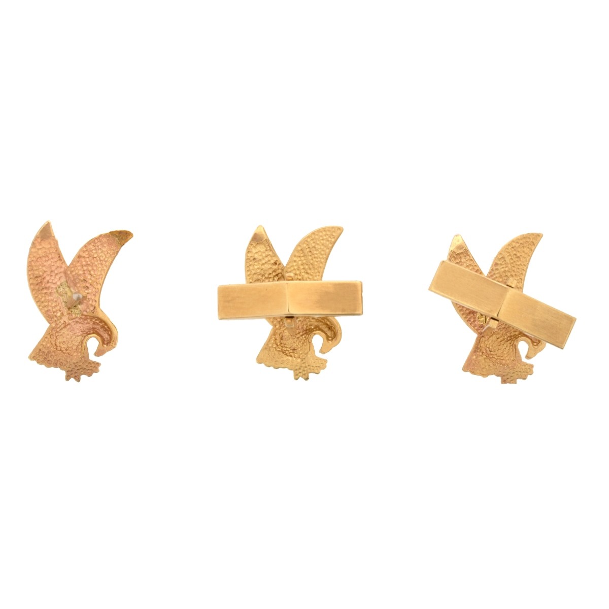 14 Karat Yellow Gold Eagle Cufflinks and Tie Tack Set. Stamped 14K. Measure 3/4" H, 1/2" W. Approx. weight: 8.78 grams. Condition: Very good condition. Estimate: $200.00 - $500.00 Domestic Shipping: $30.00