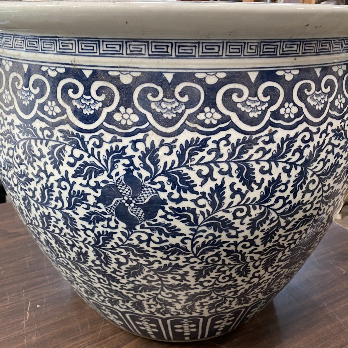 Large Chinese Qing Style Blue and White Porcelain Jardiniere. Unmarked. Busy floral decoration on surface. Measures 18-1/2" x 21'. Condition: Needs cleaning otherwise good condition. Estimate: $500.00 - $800.00 Domestic Shipping: Third party