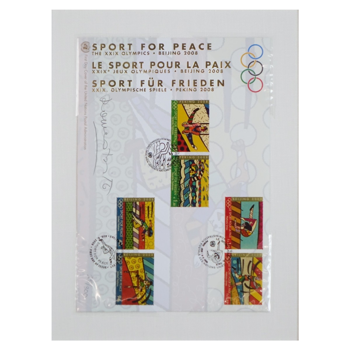 Romero Britto (Born 1963) Hand Signed Beijing Olympic Games First Day Cover Mounted in Frame. Signed and numbered 25/300. Document attached en verso. Measures 7-1/4" x 10-1/4", frame measures 15" x 18-1/4". Condition: Good condition. Estimate: $50.00 - $150.00 Domestic Shipping: $95.00