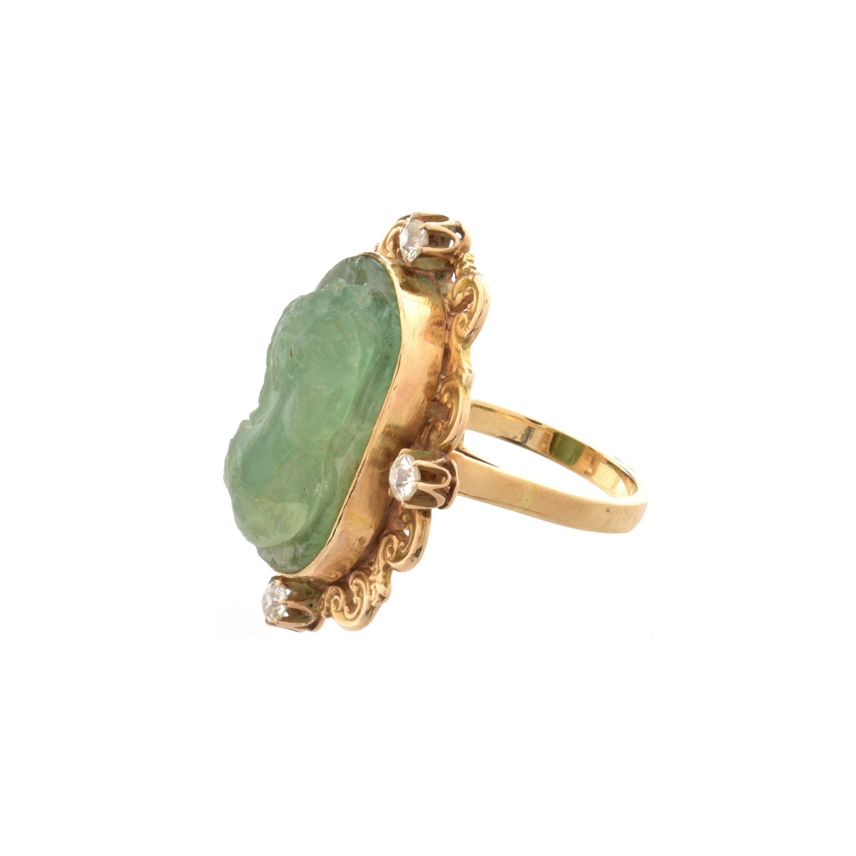 Antique Carved Emerald Cameo, Approx. 1.0 Carat TW Four Old European Cut Diamond and 14 Karat Yellow Gold Ring. Emerald with vivid color, measures 7/8" x 1/2". Diamonds G-H color, SI clarity. Ring size 7-1/2. Approx. weight: 12.92 grams. Condition: Very good antique condition. Estimate: $1500.00 - $3000.00 Domestic Shipping: $28.00