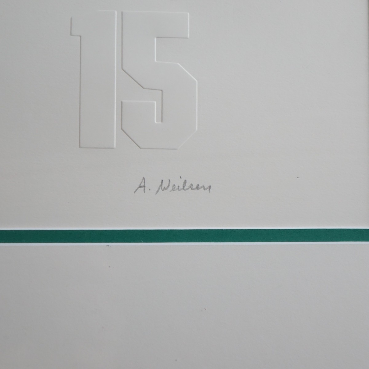 Ann Neilson (20th Century) Lithograph on Paper "Legacy 1: Boston Celtics" Signed and Numbered 56/500. Hand signed by John Havlicek, Bill Russell, Bob Cousy, Red Auerbach, and Tom Heinsohn. Measures 20" x 37", frame measures 28-1/4" x 45-1/2". Condition: Good condition. Estimate: $50.00 - $500.00 Domestic Shipping: Third party
