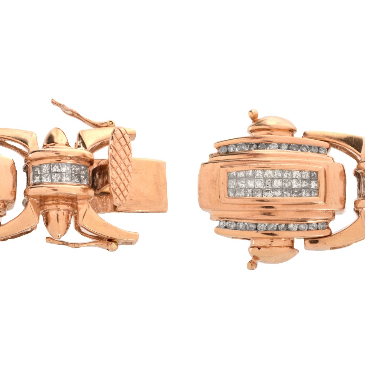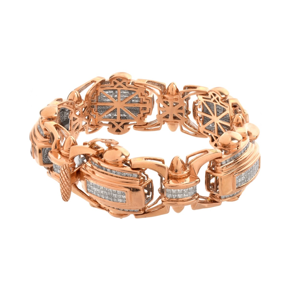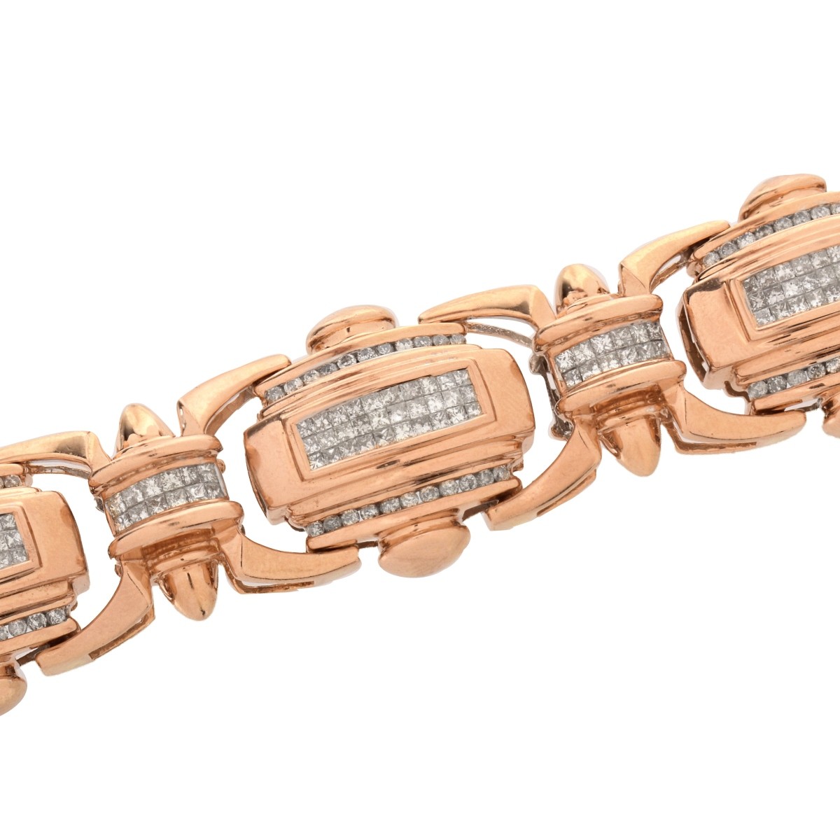 Approx. 9.0 Carat TW Princess and Round Brilliant Cut Diamond and 14 Karat Pink Gold Link Bracelet. Diamonds G-H color, VS1-SI1 clarity. Measures 7-1/4" L, 7/8" W. Approx. weight: 80.90 grams. Condition: Very good condition. Estimate: $6000.00 - $8000.00 Domestic Shipping: $30.00