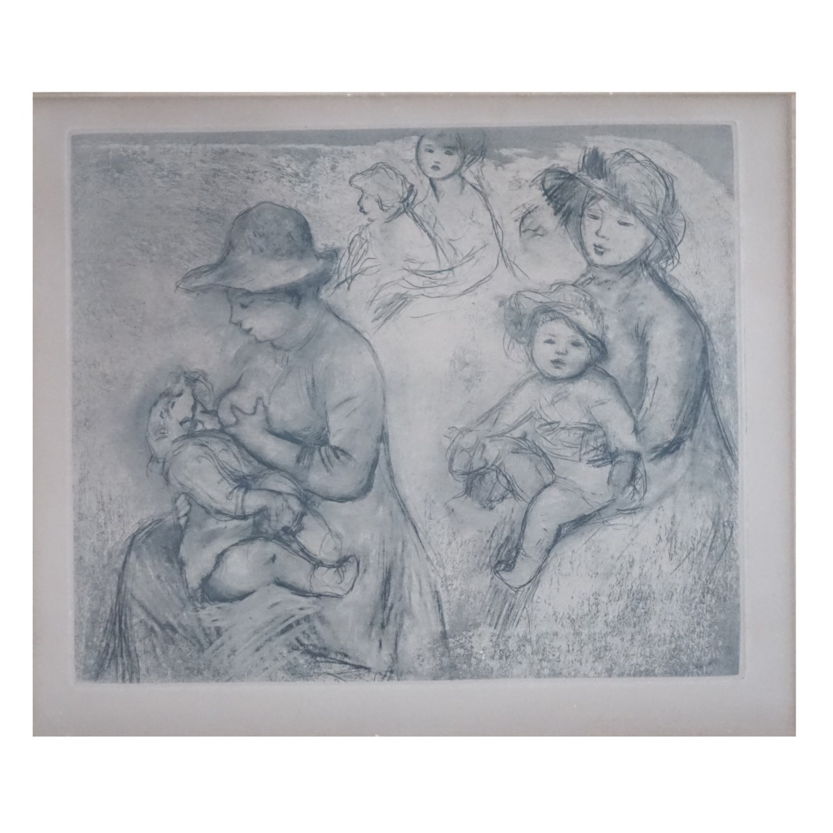 Pierre Auguste Renoir, French (1841 - 1919) Etching on Paper "Trois Esquisses de Maternite" Unmarked. Measures 8" x 9-1/2", frame measures 19-3/4" x 24". Condition: Toning to the surface otherwise good condition. Estimate: $400.00 - $600.00 Domestic Shipping: $125.00