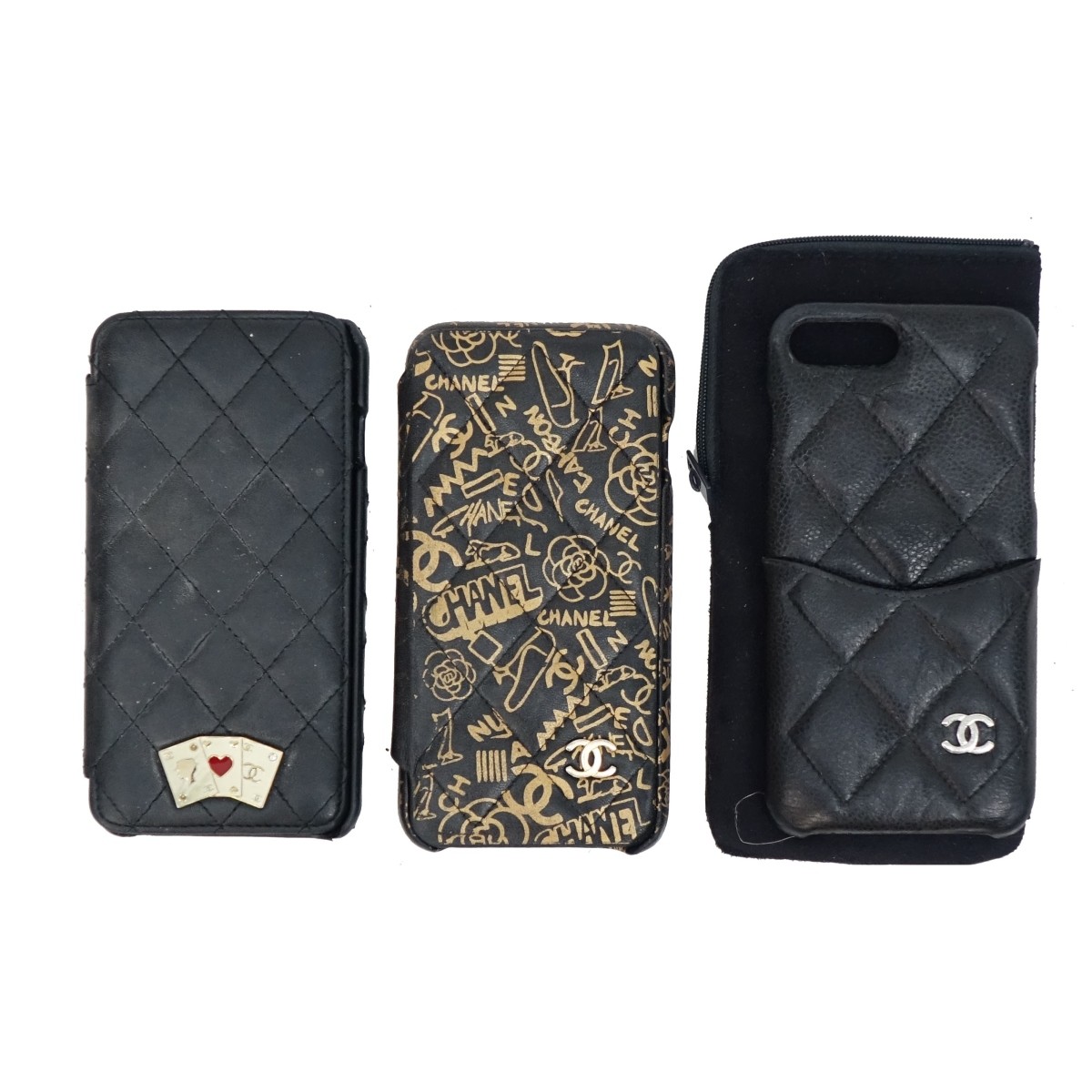 Grouping of Four (4) Designer Iphone Accessories. Lot consists of: Celine phone pouch, two Chanel Iphone 7 plus cases, and a Chanel Iphone 6 case. One has card to accompany the lot. Property of Ms Orianne Collins.10% of the proceeds with be donated to the Never Give Up Foundation. In help for children and adults with spinal cord injuries due to accidents or medical problems. Condition: Good used condition with wear. Estimate: $50.00 - $250.00 Domestic Shipping: $45.00