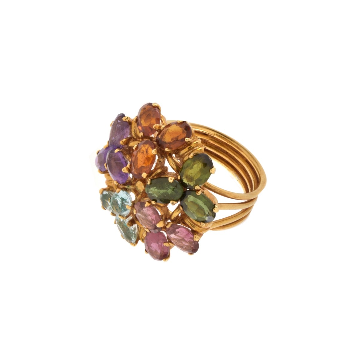 Vintage Oval Cut Multi-gemstone and 18 Karat Yellow Gold Cluster Ring. Signed JP? and stamped 750. Ring size 7-1/2. Approx. weight: 8.70 grams. Condition: Very good vintage condition. Needs cleaning. Estimate: $300.00 - $500.00 Domestic Shipping: $28.00