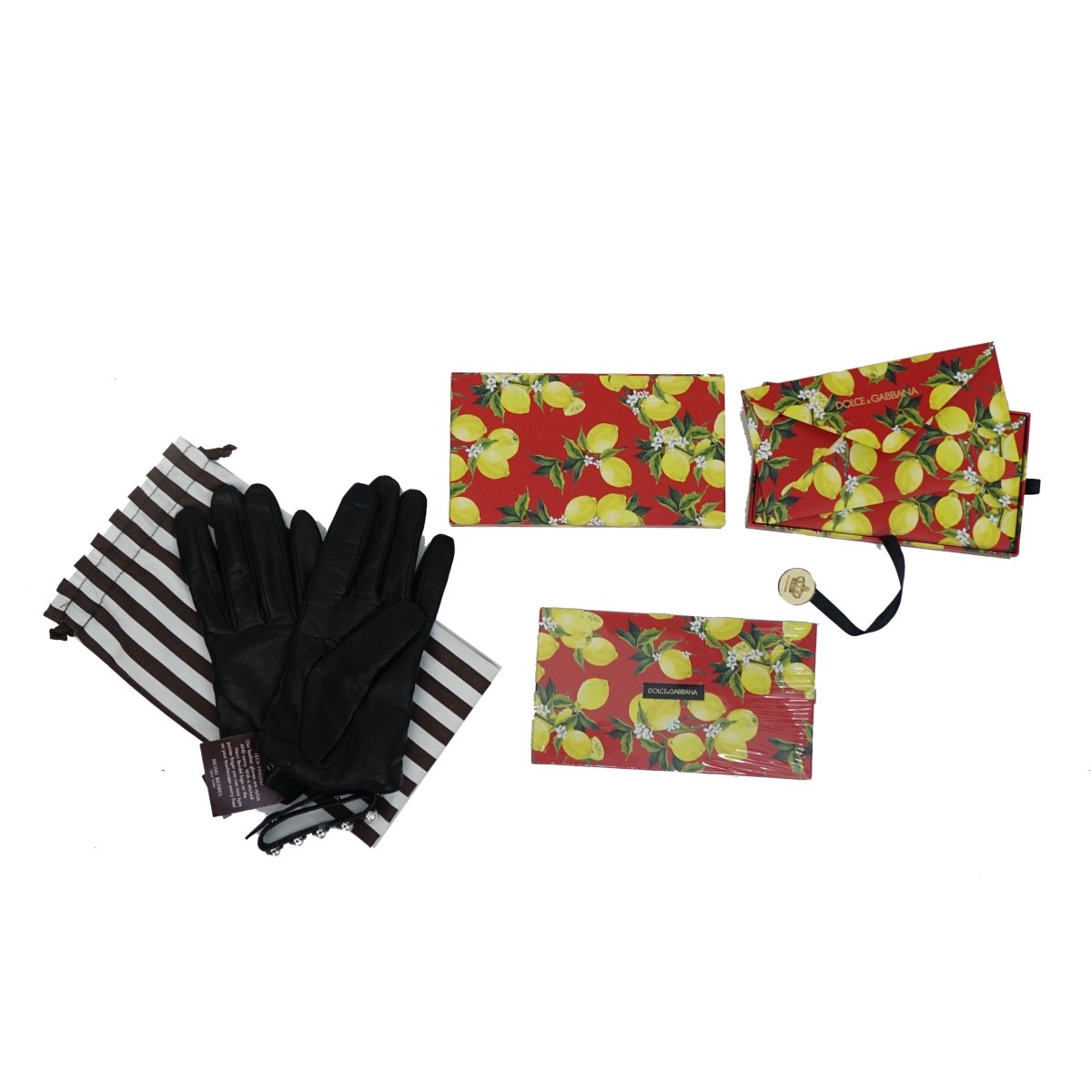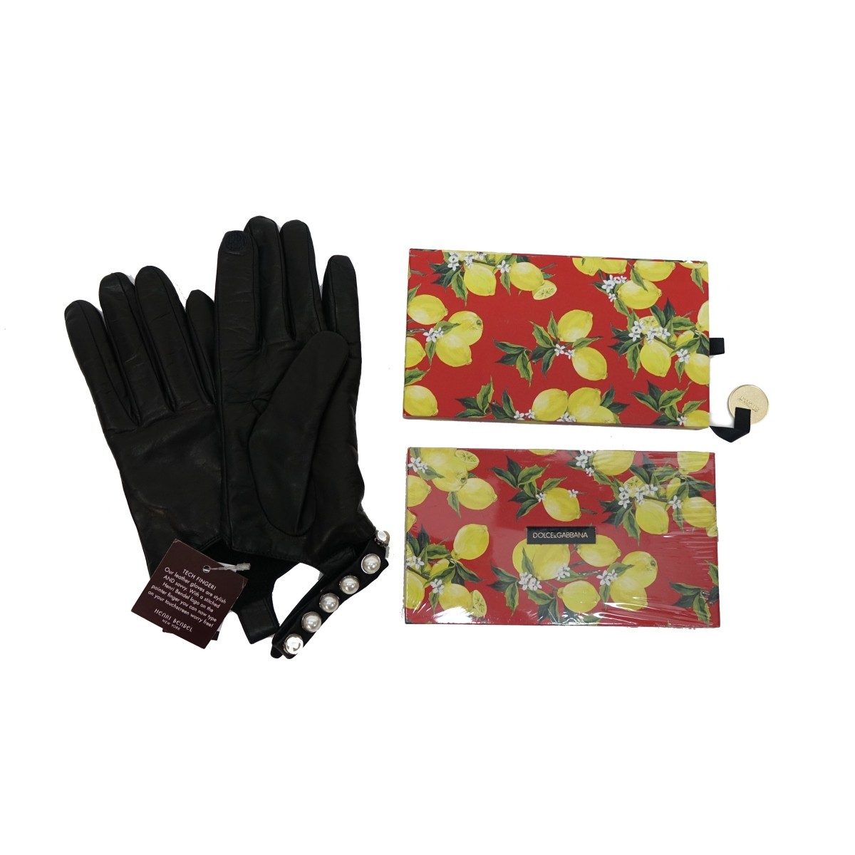 Grouping of Three (3) Vintage Designer Items. Lot consists of a pair of Dolce & Gabbana envelopes (opened and unopened box) together with Henri Bendel pearl leather gloves with tags and dust bag. Box measures 4" x 7" x 3/4", gloves size 8. Property of Ms Orianne Collins.10% of the proceeds with be donated to the Never Give Up Foundation. In help for children and adults with spinal cord injuries due to accidents or medical problems. Condition: Good condition. Estimate: $50.00 - $150.00 Domestic Shipping: $42.00