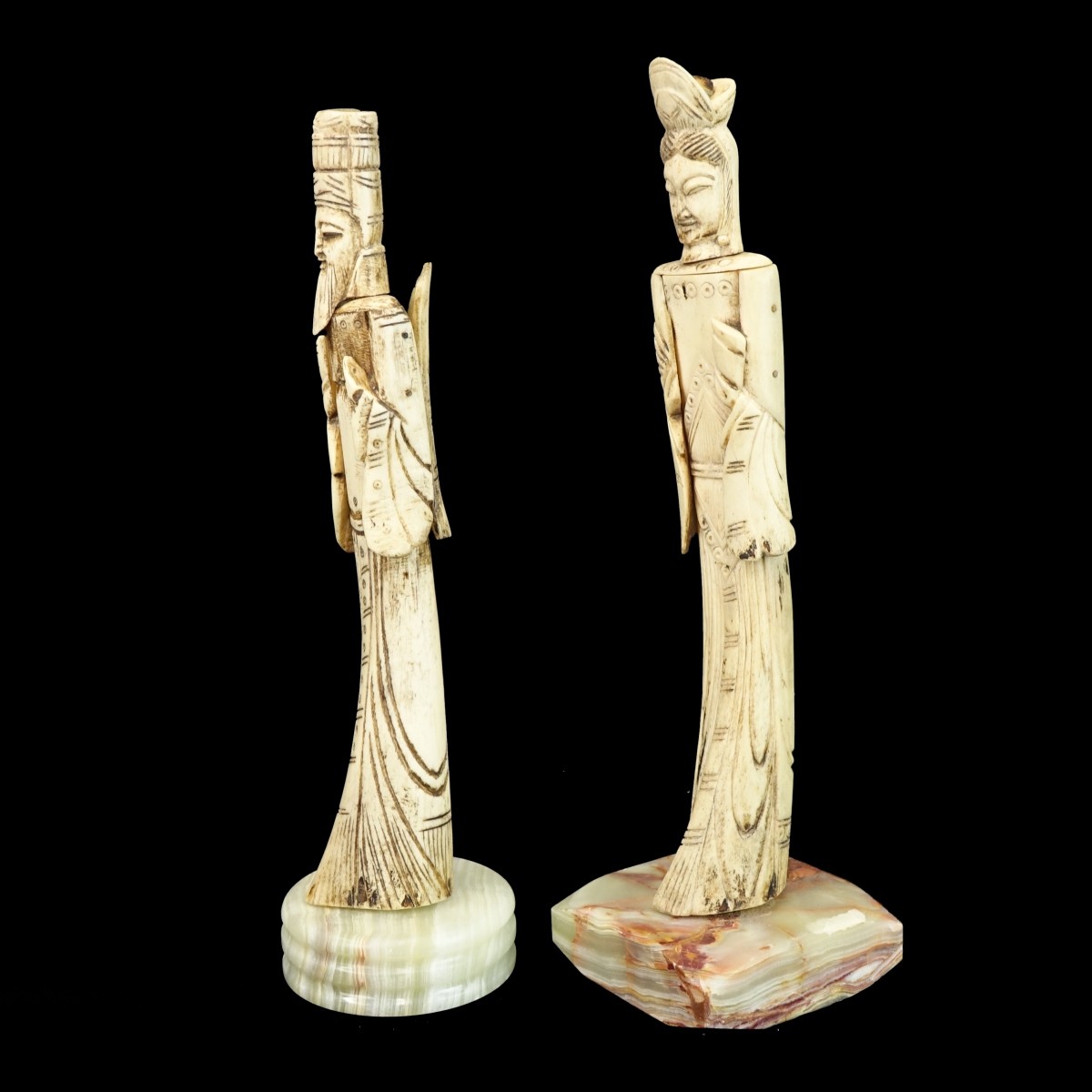Pair of Chinese Carved Bone Emperor and Empress Figures on Onyx Bases. Tallest measures 15", other measures 14-1/2". Condition: Good condition. Estimate: $50.00 - $100.00 Domestic Shipping: $72.00