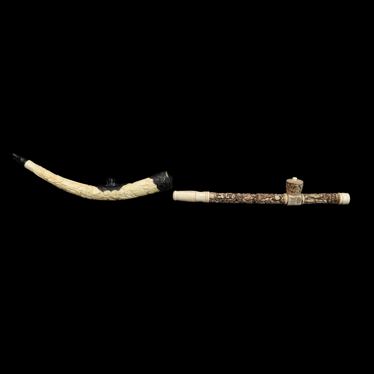 Grouping of Two (2) Chinese Carved Opium Pipes. One is mounted with metal embellishments. Each with immortal figural deep relief decorations on surface. Largest measures 17", other measures 16". Condition: One has normal hairlines to the mouth and head surfaces,other has dings on the mounts otherwise good condition. Estimate: $50.00 - $150.00 Domestic Shipping: $78.00
