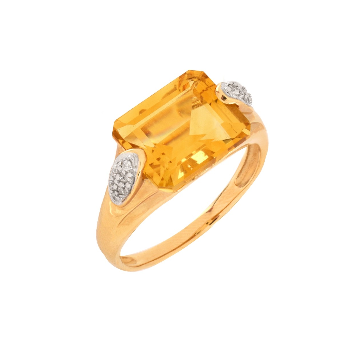 Emerald Cut Citrine and 14 Karat Yellow Gold Ring with Small Round Cut Diamond Accents. Citrine with vivid color, measures 12.0 x 10.0mm. Stamped 14K. Ring size 10. Approx. weight: 5.01 grams. Condition: Very good condition. Estimate: $200.00 - $400.00 Domestic Shipping: $28.00