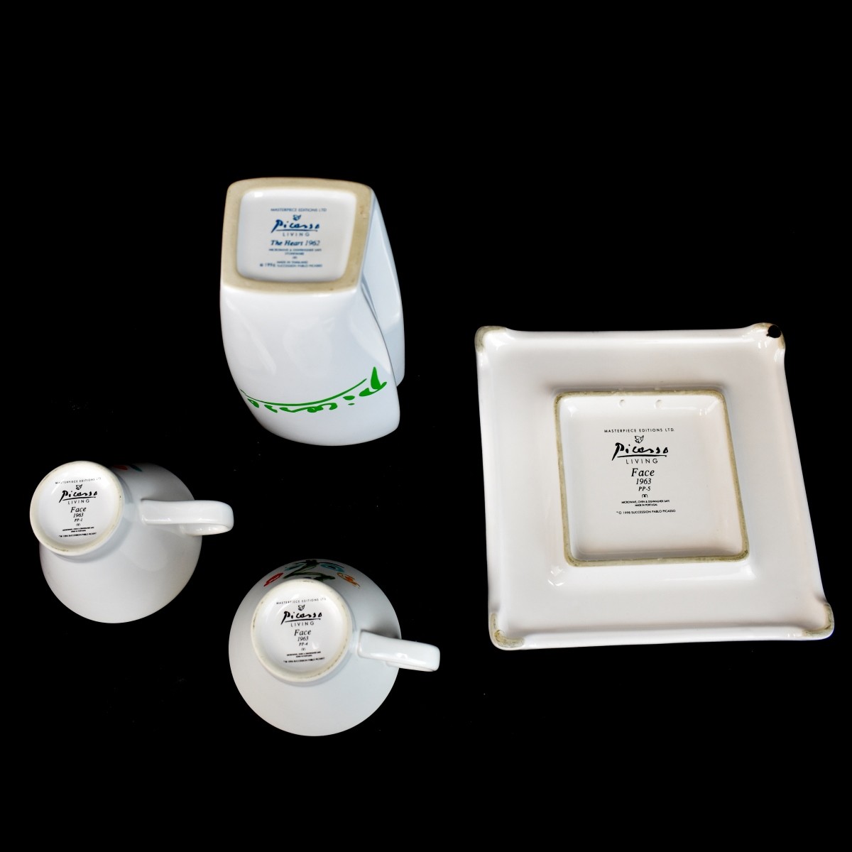 Group Lot of Four (3) Picasso Living Porcelain Tableware to Include a Vase together with Two Mugs and a Platter. Signed, title, and dated on the bottom side. Vase measures 9-1/4", mugs measures 3-3/4' x 4-1/2". Condition: Good condition. Estimate: $50.00 - $150.00 Domestic Shipping: $66.00