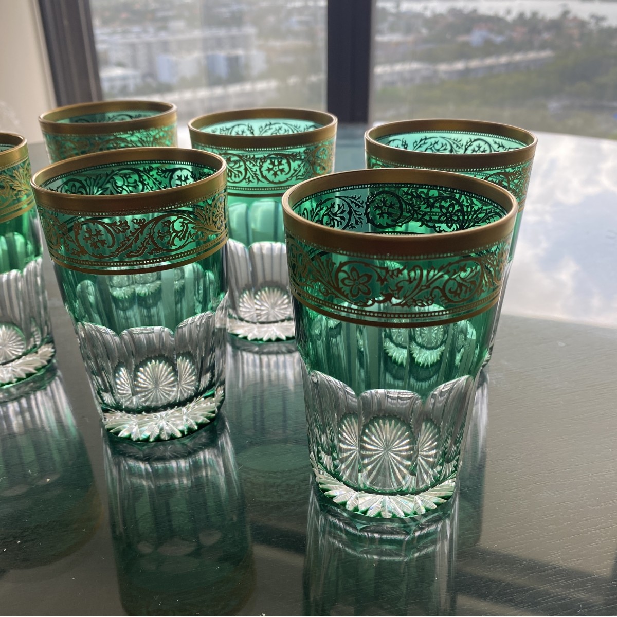 Set of Six (6) Cristal De Sevres Colored Double Old Fashioned Glasses. Signed. Gilt encrusted rim and faceted surface. Star cut base. Measures 4" x 2-1/2". Condition: Good condition. Needs a routine cleaning. Estimate: $100.00 - $500.00 Domestic Shipping: $68.00