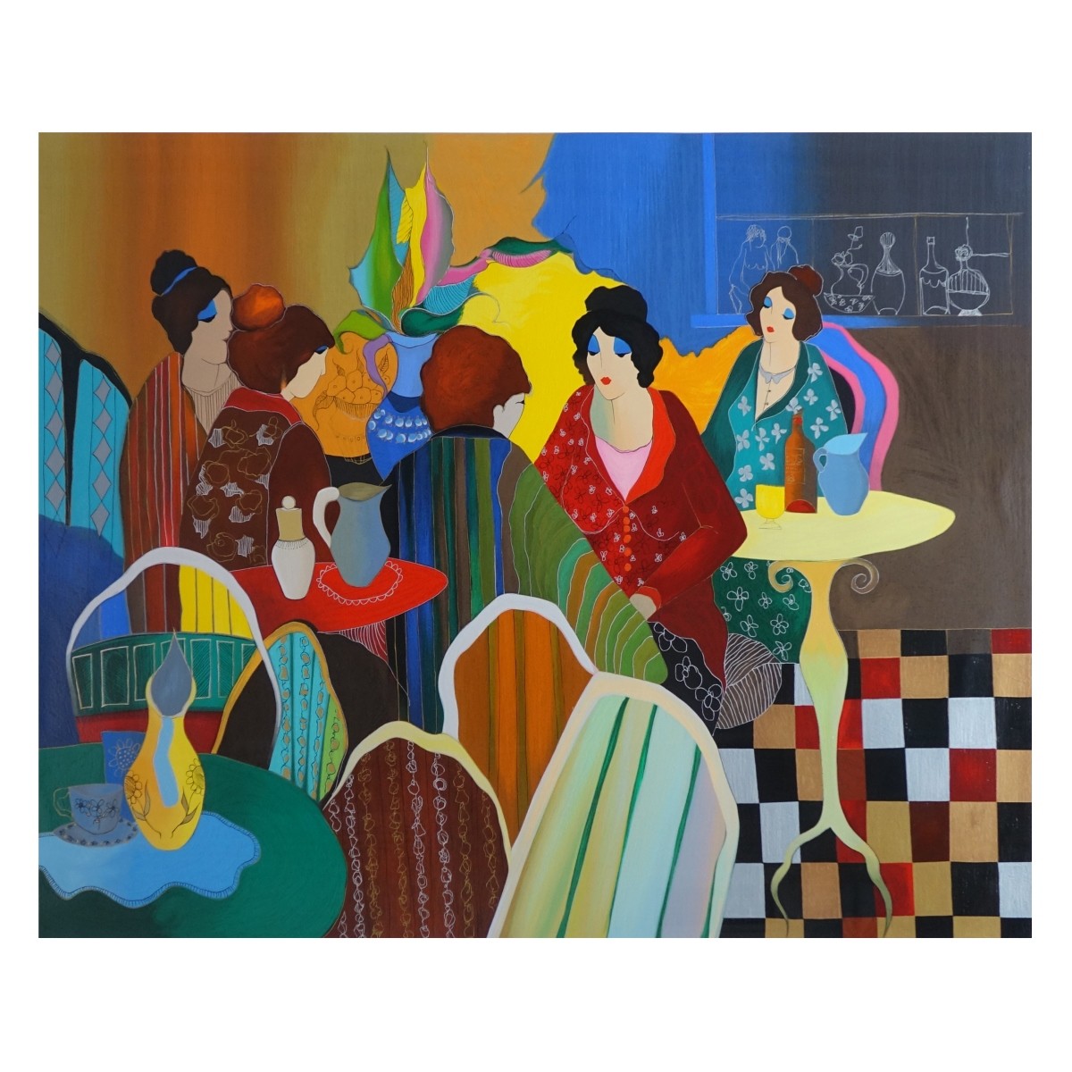 Itzchak (Isaac) Tarkay, Israeli (1935 - 2012) Serigraph on Paper "Busy Cafe" Signed and Numbered 209/350. Measures 28-1/4" x 36-3/4", frame measures 44" x 53". Condition: Good condition. Estimate: $200.00 - $400.00 Domestic Shipping: Third party
