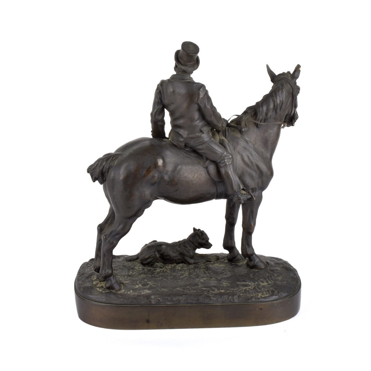 Evgeny Aleksandrovich Lansere (RUSSIAN, 1848–1886) Bronze Sculpture, Man on Horseback with Dog. Signed and dated 1884, Shtange foundry mark. Stamped Tiffany & Co, likely Tiffany & Co, London Regent Street retailed this bronze circa 1890s. Measures 10-3/8" H, 8-1/2" W. Condition: Very good antique condition. Needs cleaning. Estimate: $5000.00 - $7000.00 Domestic Shipping: $115.00