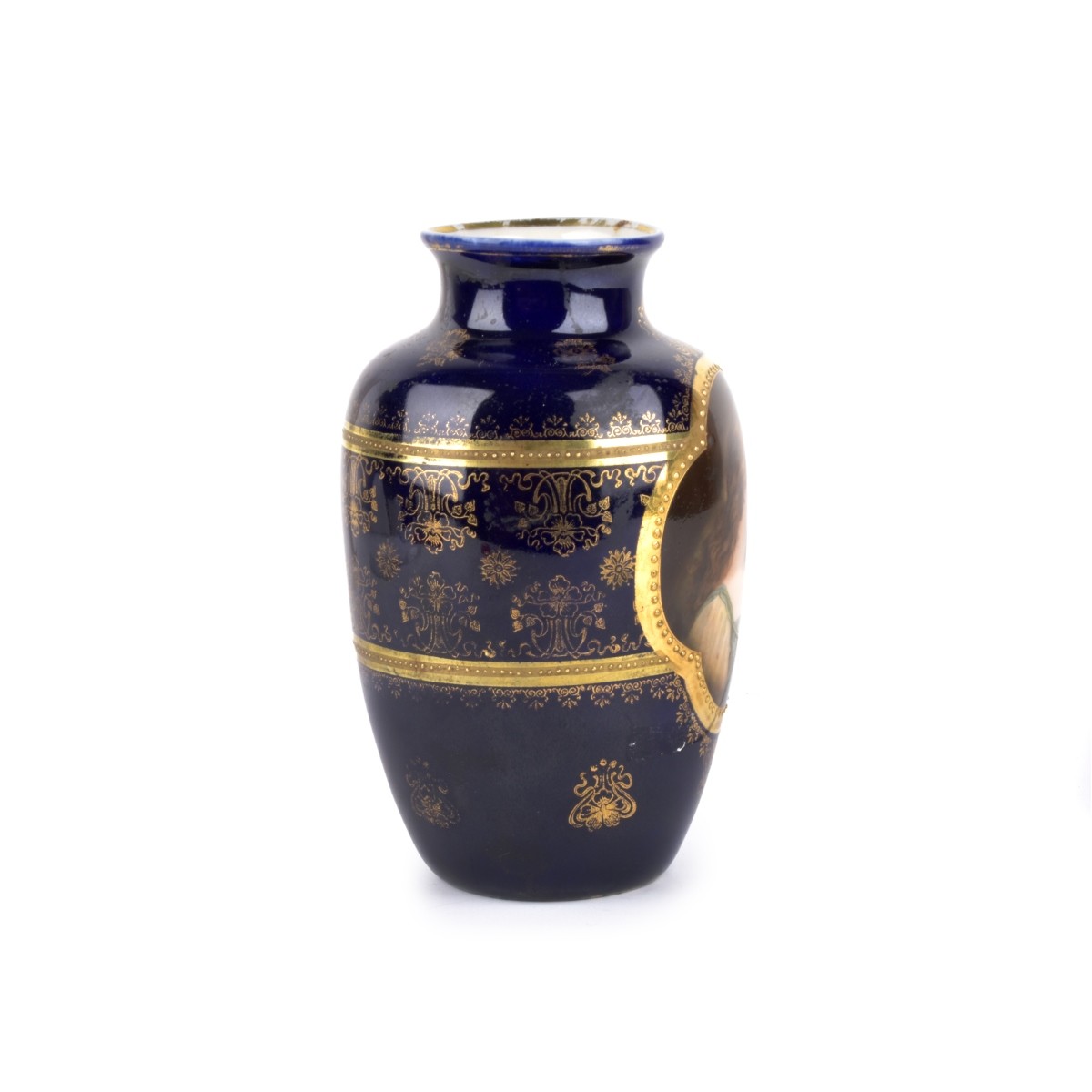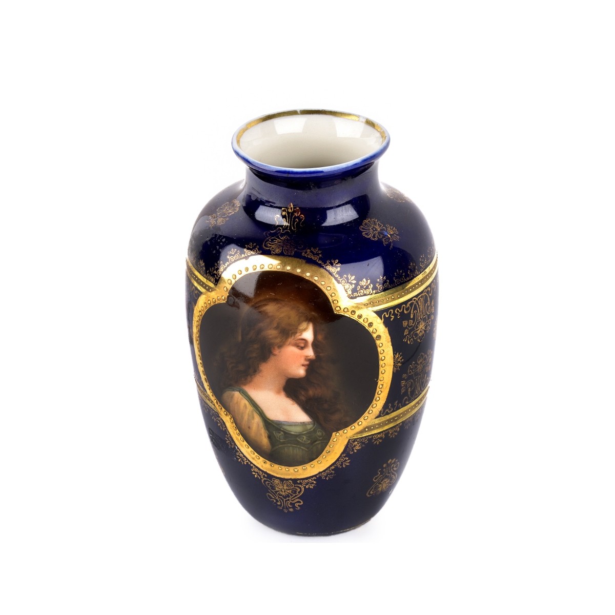 Antique Royal Vienna Cobalt Portrait Vase. Bee hive mark on the bottom side. Gilt scroll embellishments throughout and beads accent. Measures 6" x 3-1/2'. Condition: Rubbing otherwise good condition. Estimate: $100.00 - $300.00 Domestic Shipping: $45.00