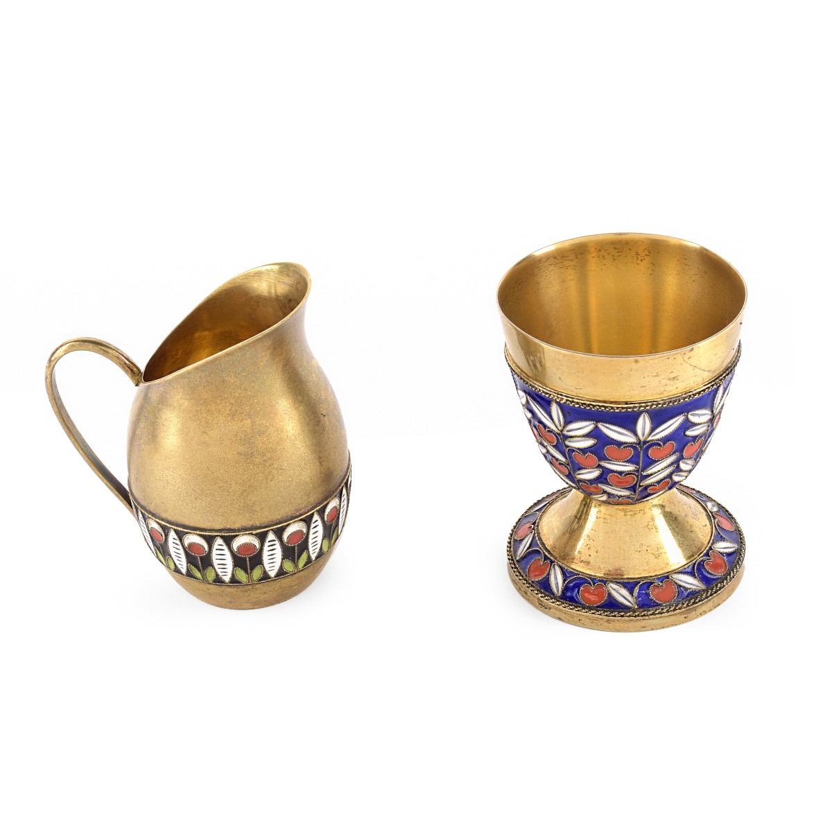 Grouping of Two (2) Russian Silver Gilt and Enameled Tableware. Lot consists of: egg cup and jug. Each marked 916 and bears a makers mark. Jug measures 2-3/4", egg cup 2-5/8". Condition: Good condition. Estimate: $200.00 - $500.00 Domestic Shipping: $38.00
