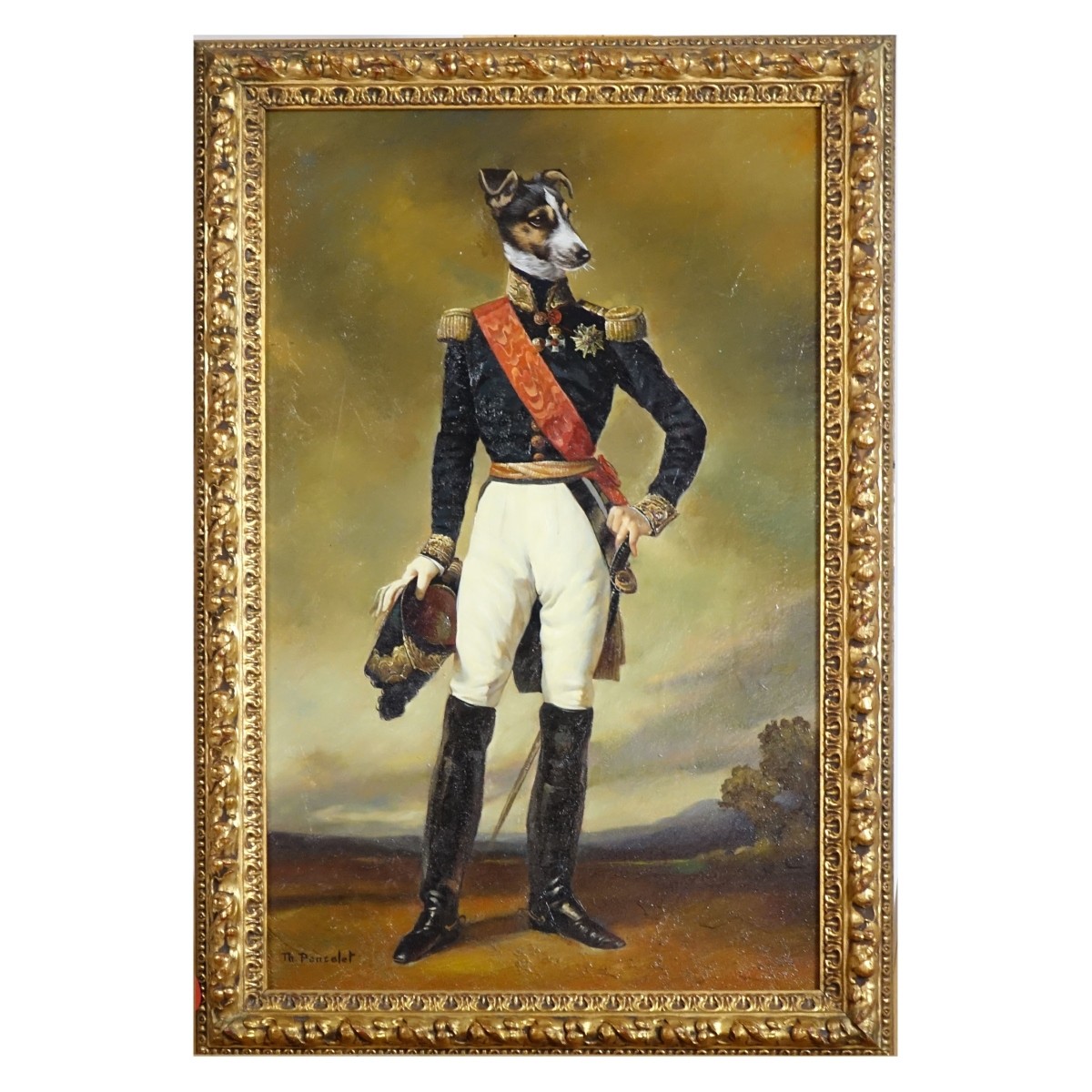 Thierry Poncelet, Dutch (Born 1946) Oil on Panel "Portrait of a Dog as Napoleon" Signed Lower Left. Measures 24-1/4" x 14-3/4", frame measures 28-3/8" x 18-7/8". 10% of the proceeds with be donated to the Never Give Up Foundation. In help for children and adults with spinal cord injuries due to accidents or medical problems. Condition: Good condition. Estimate: $1000.00 - $3000.00 Domestic Shipping: $145.00