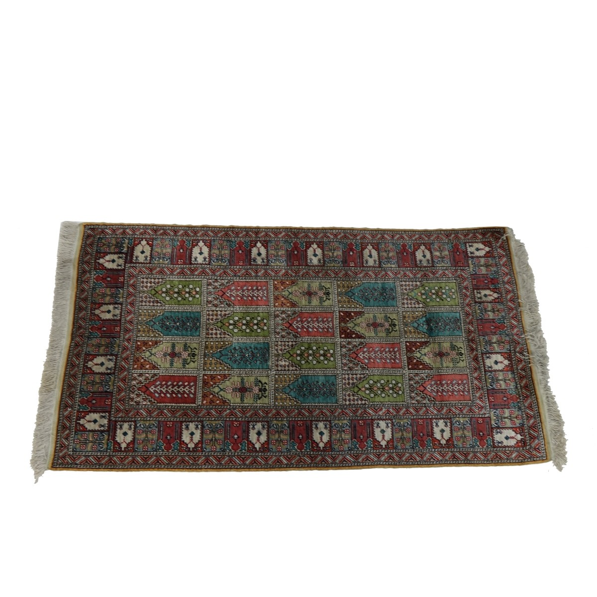 20th Century Middle Eastern Multi Color Silk Rug. Busy floral and intricate patterns motif. Measures 52" x 28-1/2". Condition: Needs cleaning otherwise good condition. Estimate: $100.00 - $300.00