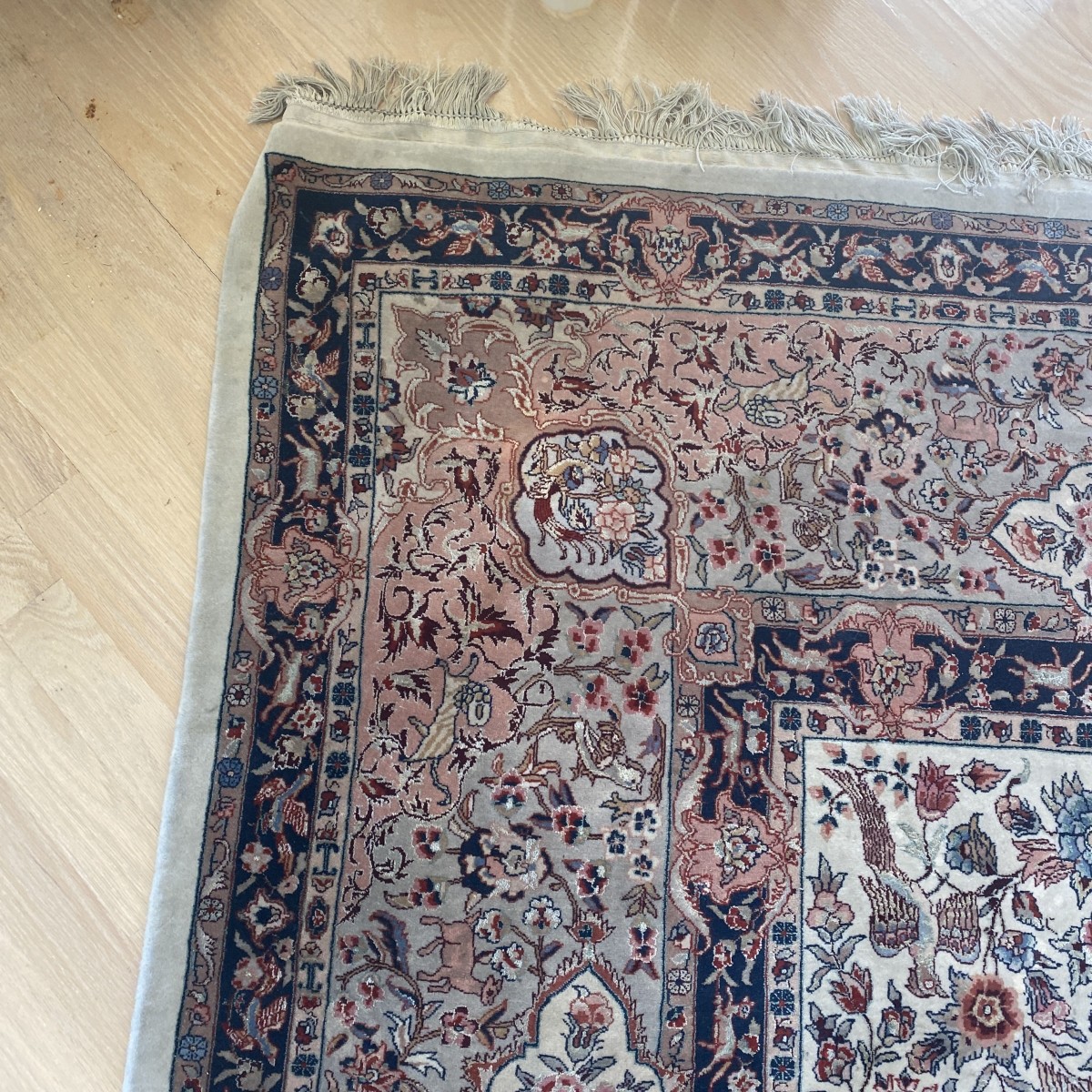 Semi Antique Persian Oriental Silk Rug. Busy continuous floral decoration. Measures 98-1/2" x 118-1/4". Condition: Good condition. Estimate: $200.00 - $1000.00 Domestic Shipping: Third party