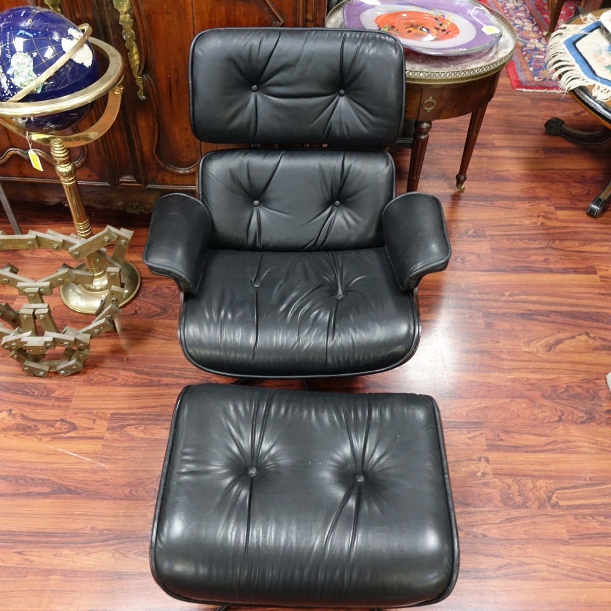 Style of Eames Lounge Chair and Ottoman. Made in Canada. Lounge chair measures 35" x 34-1/2", ottoman measures 15-1/2" x 26-1/2" x 21-1/4". Condition: Ottoman has some scratches to the wood, leather is in good used condition, lounge chair has some rubbing to the wood. Estimate: $100.00 - $500.00 Domestic Shipping: Third party