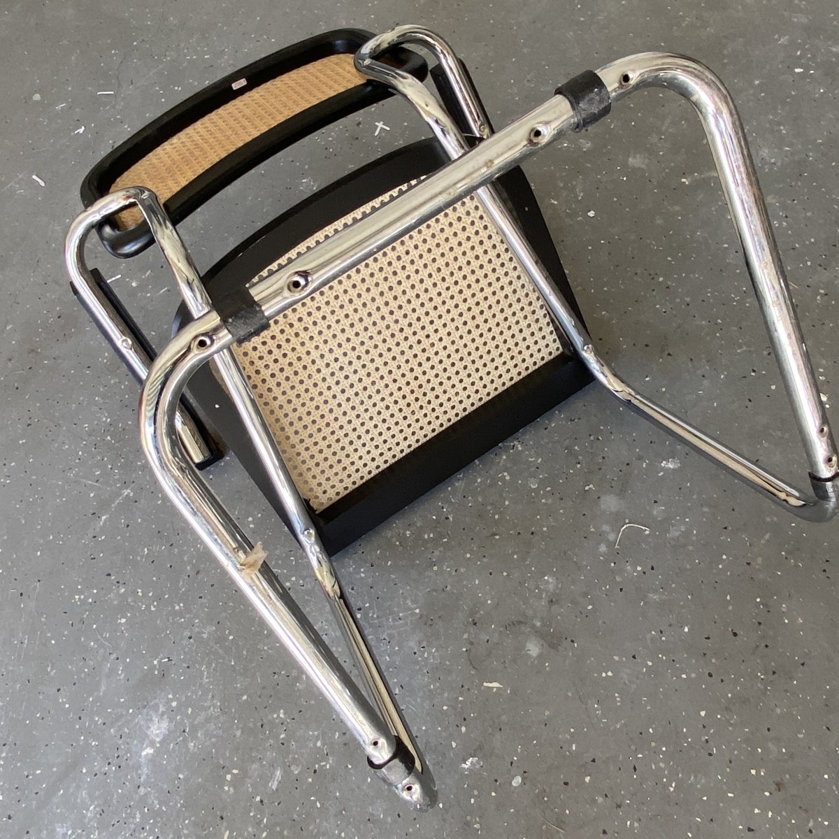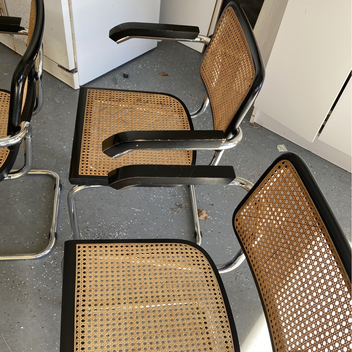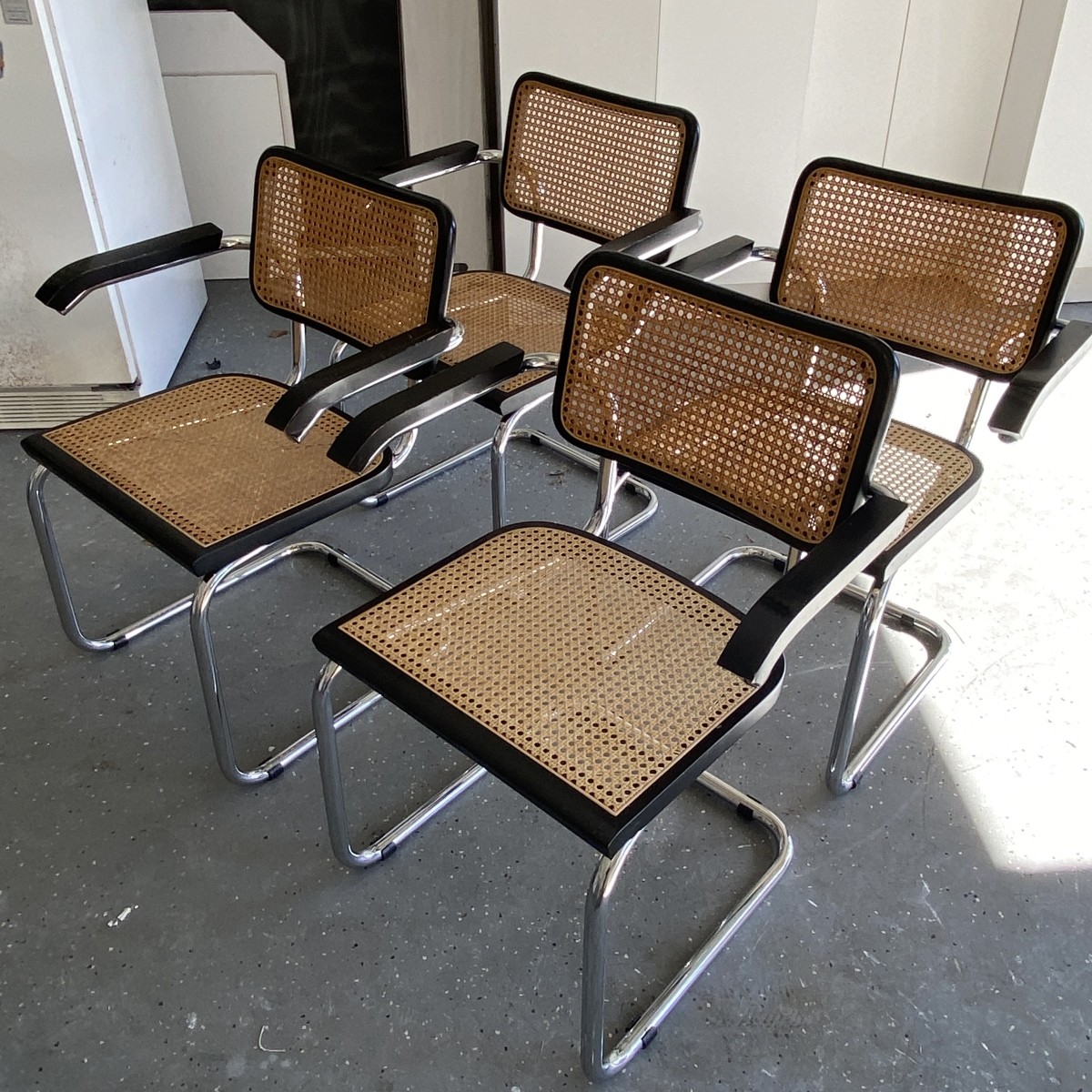 Set of Four (4) Marcel Breuer Style Cesca Cane and Chrome Armchairs. Unmarked. Measures 32" x 24". Condition: Scratches to the wood otherwise good condition. Estimate: $100.00 - $200.00 Domestic Shipping: Third party